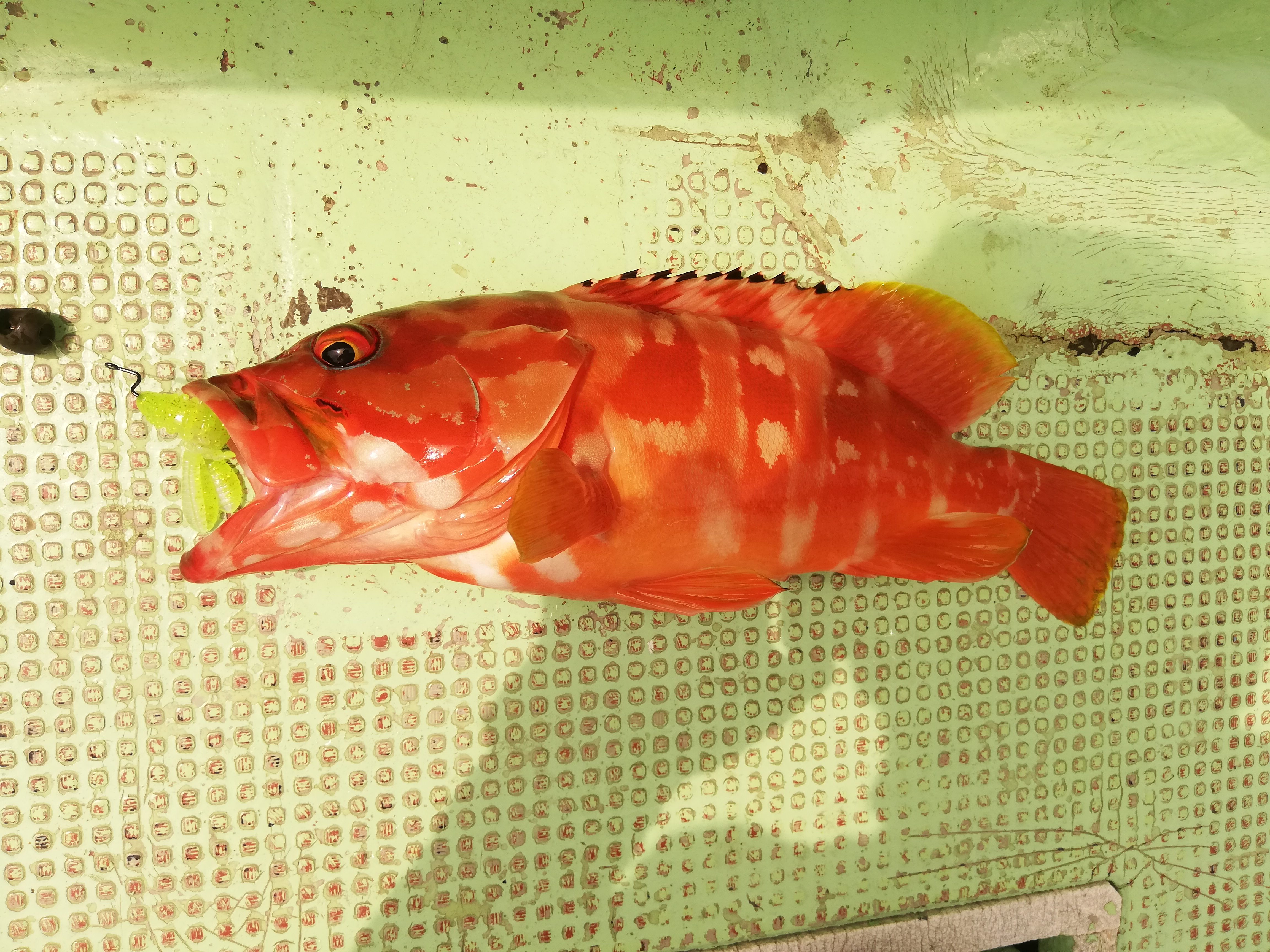 途中アカハタのポイントでは、テキサスリグ シンカー21グラム、一誠ジャコバグ4インチのリフト&フォールでアカハタ38センチも!