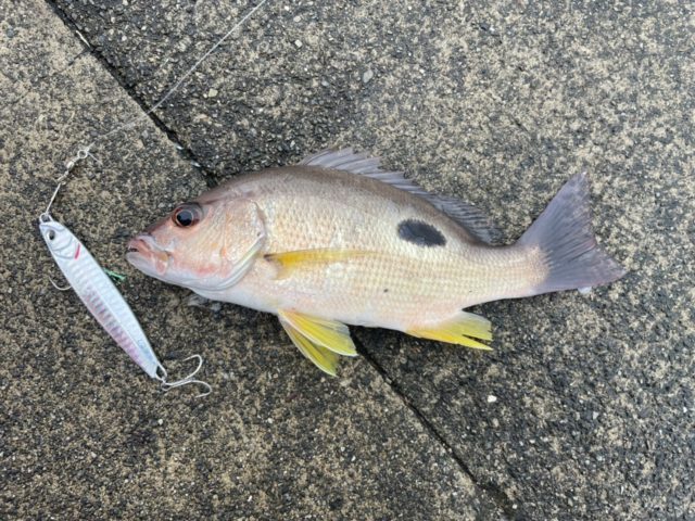調べてみるとクロホシフエダイっぽい。初使用のタックルで人生初フィッシュ!