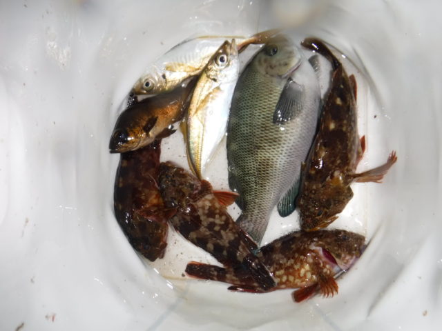 豊浜漁港周辺に夜釣りに行ってきました。仕掛けは電気ウキの流し釣りで、エサはアオイソメを使用、堤防の基礎付近に仕掛けを流しました。仕掛け投入直後からアタリが続き、アジ・カサゴ・メバル・グレなどが釣れました。潮止まり時に喰い渋りもありましたが、五目釣りを楽しむことができました。