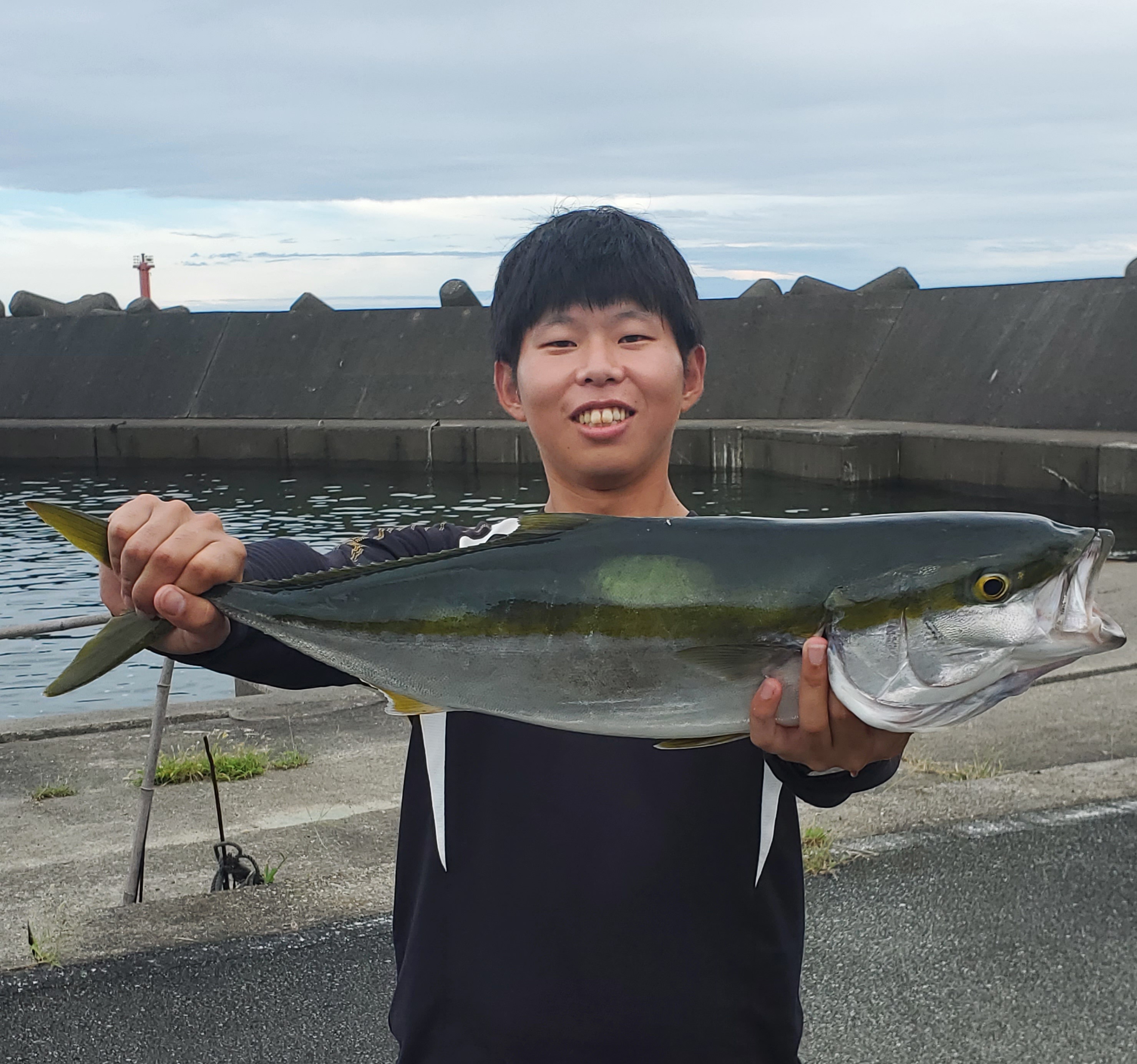 松阪店の利見くんと鳥羽市国崎の勝丸さんでたて釣りに行ってきました。この日はうねりがキツく酔いながらの釣行でた。最初はたて釣り仕掛けで青物を狙いつつベイトのアジを集めていました。ここで船長さんからサビキでアジを集めた方が良いとのことでしたのでサビキでアジを確保し、いざカンパチのポイントにいきました。ポイントでは船長さんがカンパチの群れを細かく追ってくれていたので移動の度にすぐ仕掛けを投入すると、すぐに食いついてきました。仕掛けは根掛かりが多いとのことなので船長の教えてもらったとおりに、一番したの針を切りアジを一番上の針に一匹つけ、釣っていました。最終的にはシオが9匹、ツバス3匹、大ハマチ1匹、マダイ1匹と大漁で終わりました!
