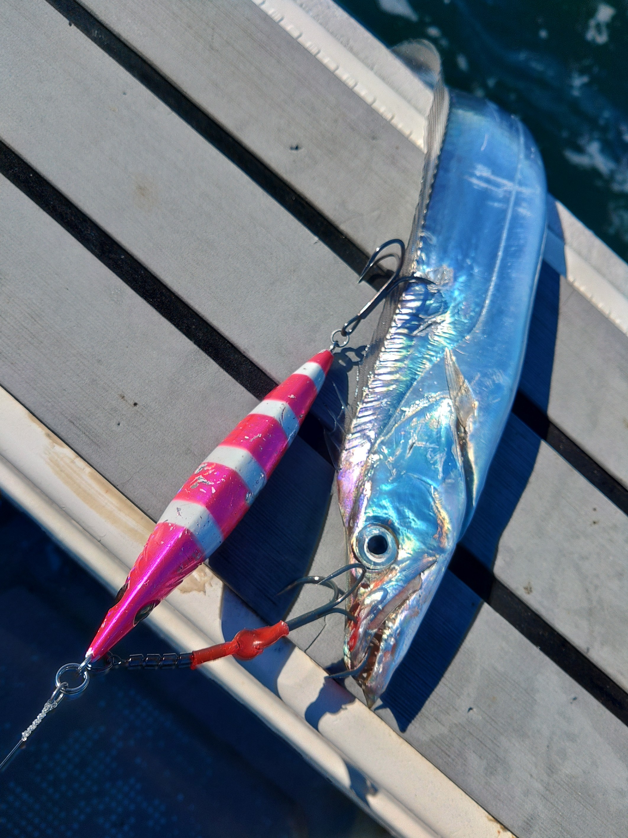 開始早々水深20~30mのポイントで名古屋北店の森チーフが立派なブリ!!他も船中でぽろぽろワラサ~ブリが揚がる!!ジグは全てSグライド!!反応があってもなかなか口を使わない事が多いこともありますが、なぜかSグライドには船中連発ヒット!!途中伊良湖沖のタチウオ狙いへ!!ここではメタボスイマーを落としてスローなワンピッチどんだけでも釣れそうな程連続ヒットの嵐!!渋くなったらカラー変更&フォール主体のアクションでまたまた連続ヒット!!お土産確保で癒されたところで再び青物狙いへ!!反応あれども当たらない時間が過ぎていくもラスト30分でプチ時合い突入!!周りがヒットしていく中、船長より終了3分前のアナウンスが流れたところで私に待望のヒット!!結構走られながら浮いてきたのは82㎝6kgクラスのブリでした!!