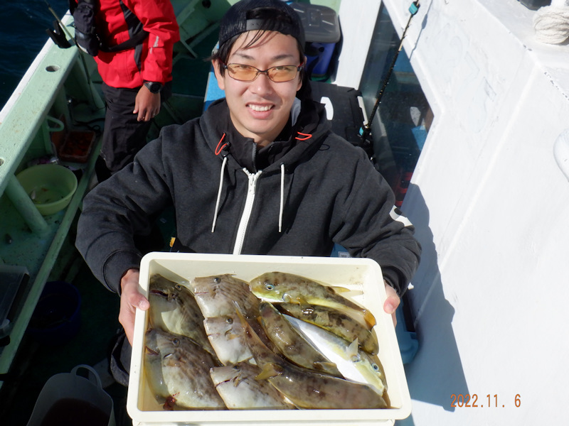 今回は久しぶりに師崎の七福丸様にお世話になりカットウ、カワハギ釣りに行ってきました!カットウでフグを釣る気満々でしたが今はカワハギのポイントに行っていてヒガンフグは釣れないとのことなので急遽カワハギタックルを準備し行ってきました!フグはあまりといわれていましたが取り合えずカットウからスタートしすぐにカワハギゲット!その後もぽつぽつカワハギ、サバフグが釣れたのでカットウからカワハギにシフト!アサリを付けて狙っていきますがエサ取りのあたりはあるがなかなか本命のあたりがでず苦労しながら1匹釣ったところでサバフグの猛攻に会い針が延ばされるのでカットウに変更!その後もぽつぽつ拾い釣り時間が来たので終了しました。帰ってから早速カワハギは刺身に、もちろん肝醤油で食べましたがこれが抜群にうまい!この時期のカワハギは肝パンでおいしいのでお勧めです!また今度はヒガンフグ狙いで行きたいと思います。