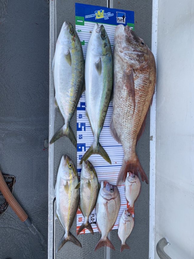 この日は天気も良く大山沖へ直行!朝のジアイで同行者にいきなりのマダイ80センチ!さらにシオも!大潮ながら底潮が動かず厳しい時間帯もありましたが私にもアタリ!ワラサをゲット!続いてチダイも。最後に良い手応え!なんと珍しいヒラマサまでゲット!