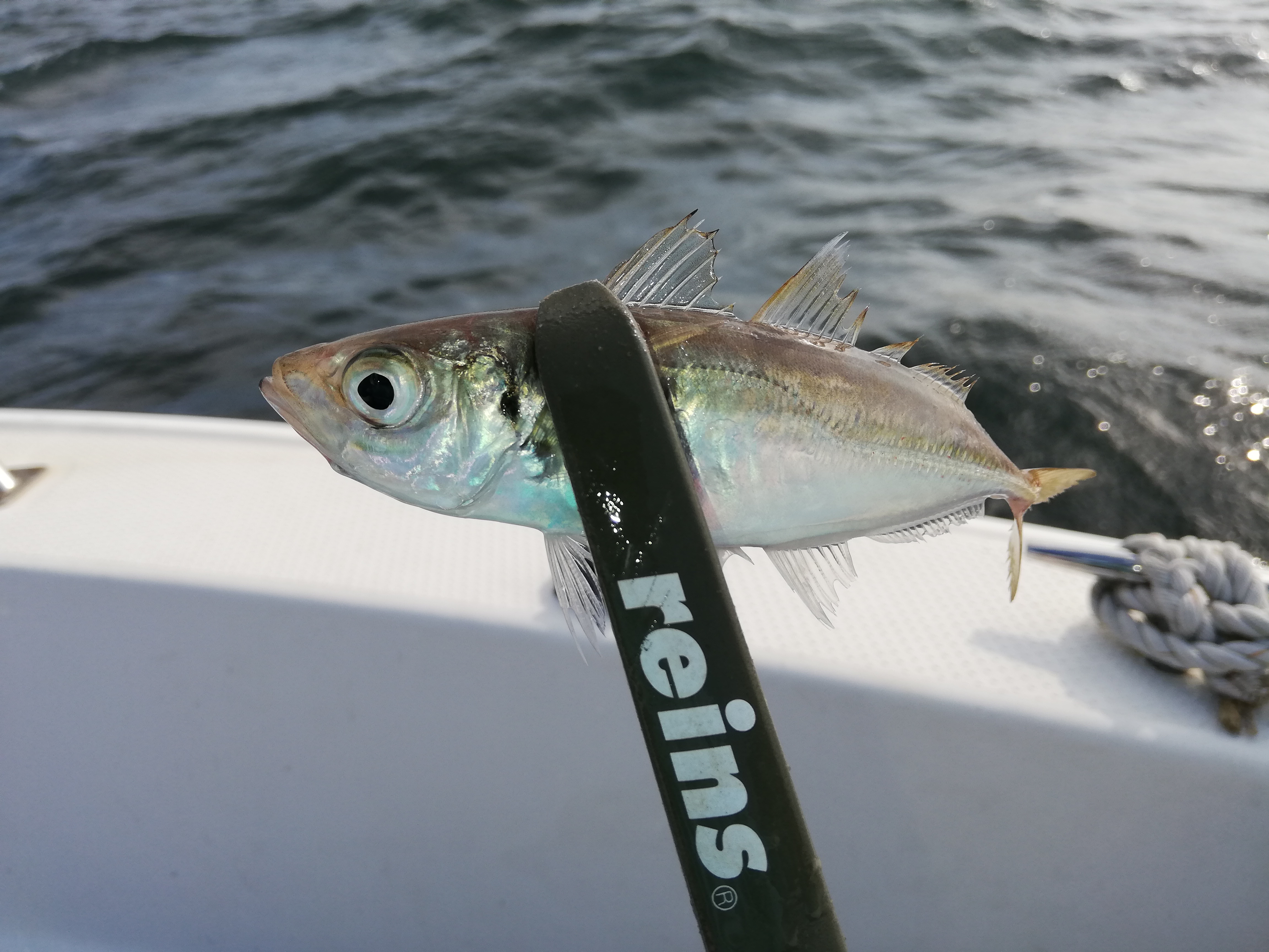 ラスト一時間はのませ釣りへ変更。朝釣ったアジをつけて落とします。アジが暴れたりしますが食いつくまでにはいかず。するとアジが不審な動きを…そのまま待っていると食いついた!合わせると乗りましたがすんなり上がってくる。青物ではなさそうでしたが途中でバレてしまいました。船長さんがヒラメっぽかったと…残念。