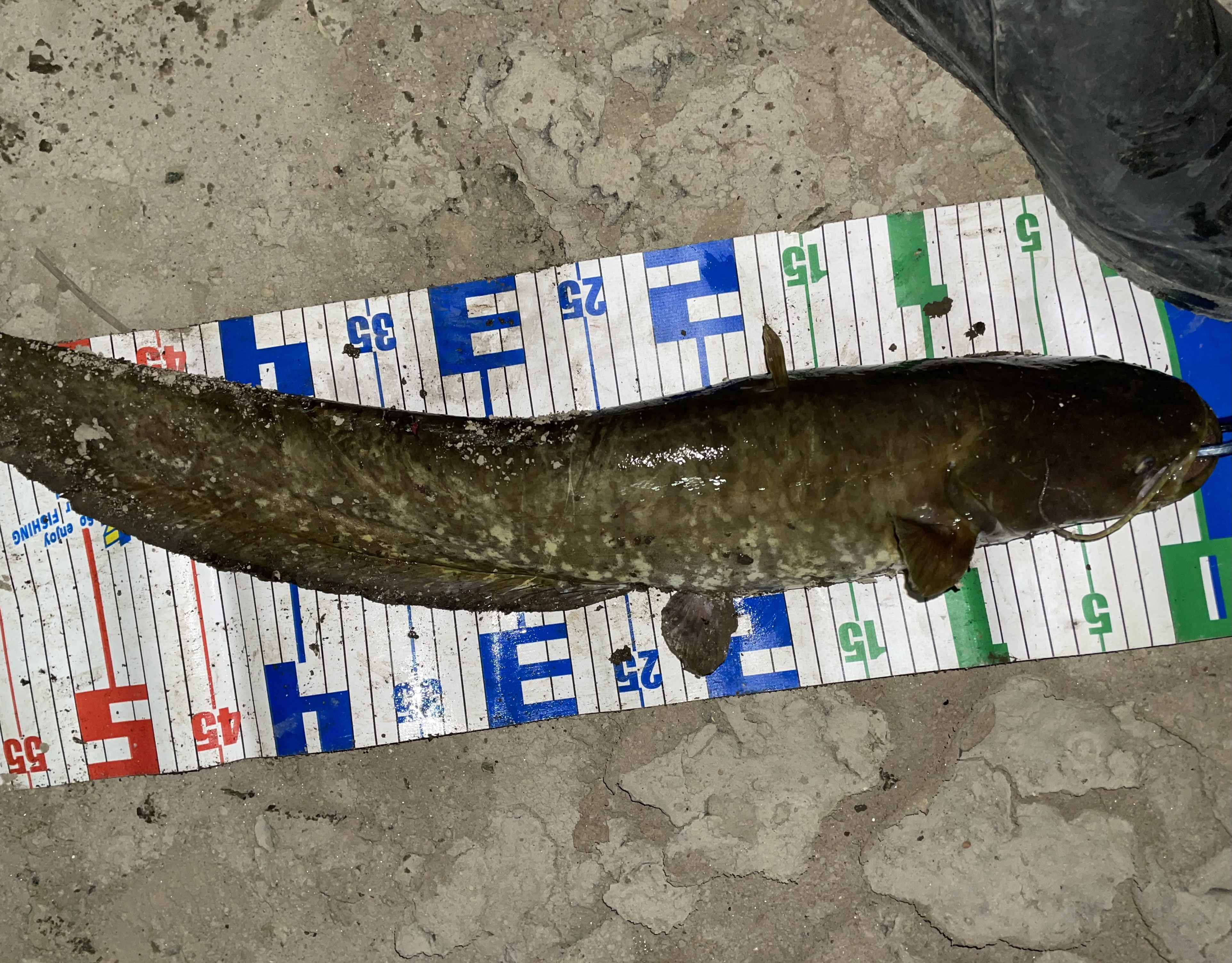 かなりやる気が無くなったので、手っ取り早く釣るためにいつものレンジバイブ70ESで橋脚を打つとすぐヒット!ですが、本命ではなく外道のナマズでした…。続いてすぐヒットしましたがなんかエイっぽい?と思いきや、今度はシーバスのスレでした!ボイルも多くなってきてチャンスかと思いきや、そこからまさかのナマズ2連発…。やたらとナマズの活性が高い日でした!