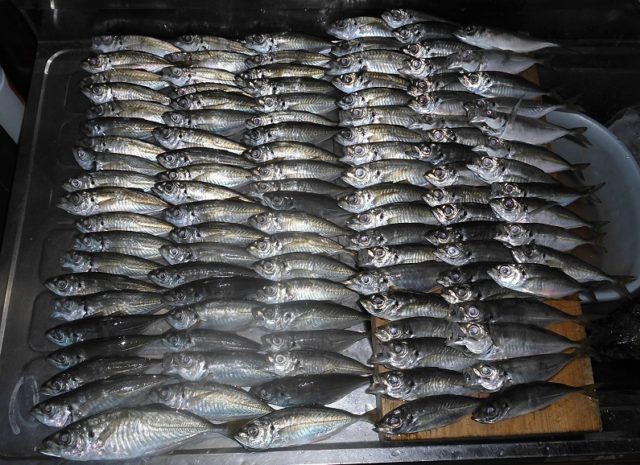 休憩して夕暮れ前の3時過ぎから釣り始めるとアジが1匹2匹と釣れ その後フグにやられまくるので場所移動、しかしどこもフグだらけで暗くなってやっとアジが釣れるが2-3匹ずつの群れなのかパタパタ釣れて沈黙、更にレンジもバラバラで上かと思えば底だったりと手を焼くレベル。それでも前日よりは早い時間から釣りをしているのでアジを拾い56匹、夜中の1時半に最後の移動をして探るコト2時間で何とか15匹追加して終了です。