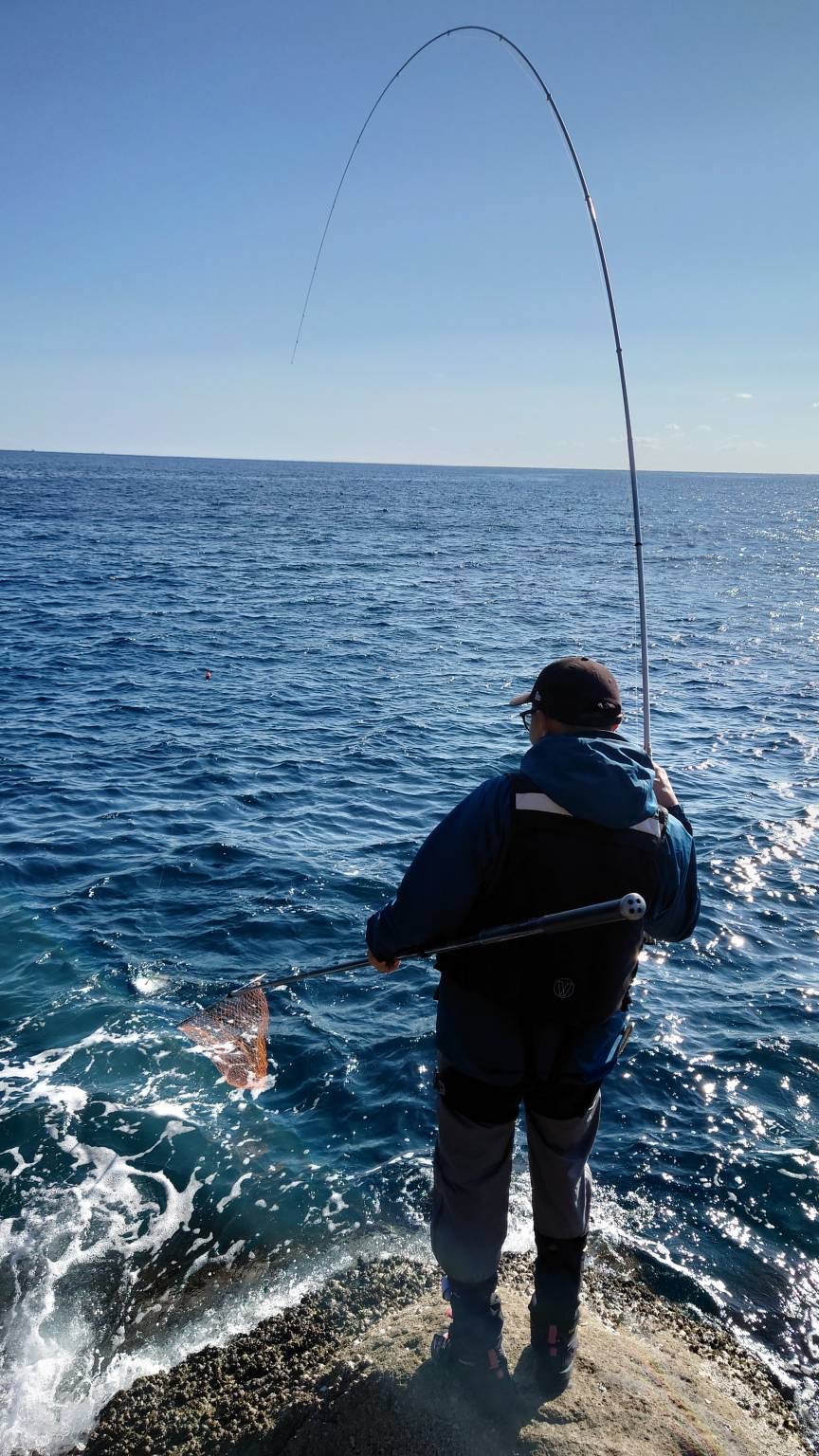 しばらく当たりがなく同じポイントで狙うと強烈なアタリ!沖で食わすも一瞬で磯際まで走られなんとか耐えるがチモト切れ。悔しい。その後は、沈黙。納竿としました。磯楽しすぎ!