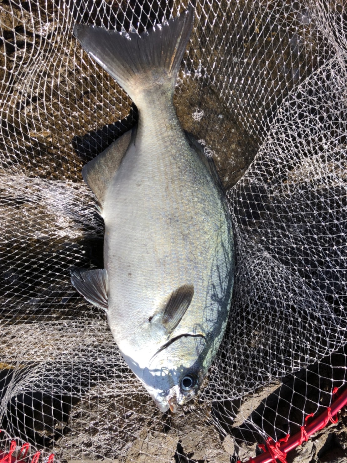 ドキドキしながらイノ貝に渡り、竿を出すと幸先よくコッパグレが釣れました!最終的には35センチ程のグレも釣れましたよ〜