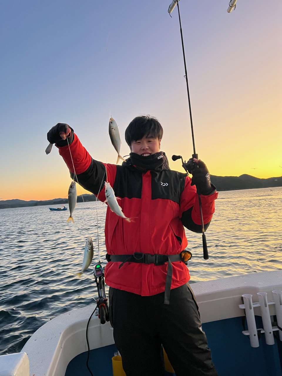 カゴにアミエビを入れて開始!すぐアタリ!アジや!と思ったらムツ、、気を取り直してもう一度投入。隣であずあずめっちゃ釣ってるし、、そこから頑張って追い上げます!アジ4連!めっちゃ楽しい!エサ用のアジ釣りですけどこれだけでと充分楽しかったです!アジ数十匹釣れたところで本命のノマセ釣り本番!狙いはマハタかクロムツ!