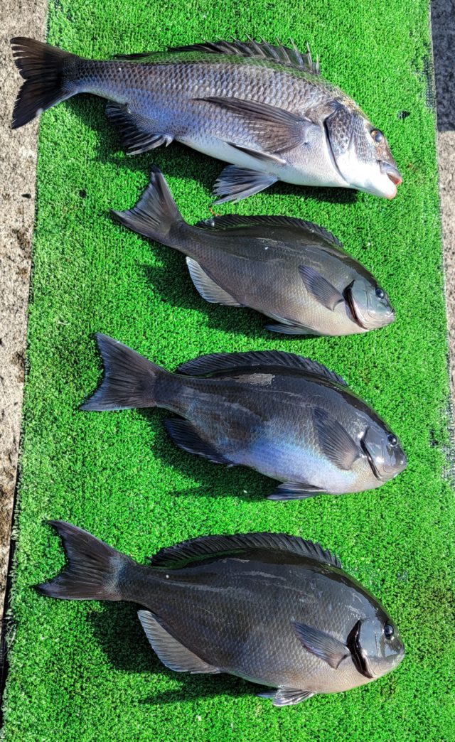 2023年初釣りは海野の垣内渡船さんです。当日は予想以上の爆風で船長と相談の結果、黒岩のハナレに渡礁しました。午前中30cm程の尾長グレを釣ったものの単発のみ。突然足元にタコが現れ、同行していた松阪店の世古さんがタモでゲット。後で計ってみると4.6kgの超巨大タコ。その後も竿を振り続け、アイゴ40cmとチヌ43cmを追加し納竿しました。他の磯では46.5cmの大型グレも釣れており今後も楽しみです。