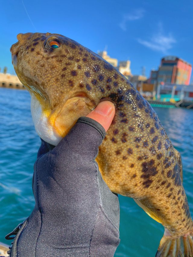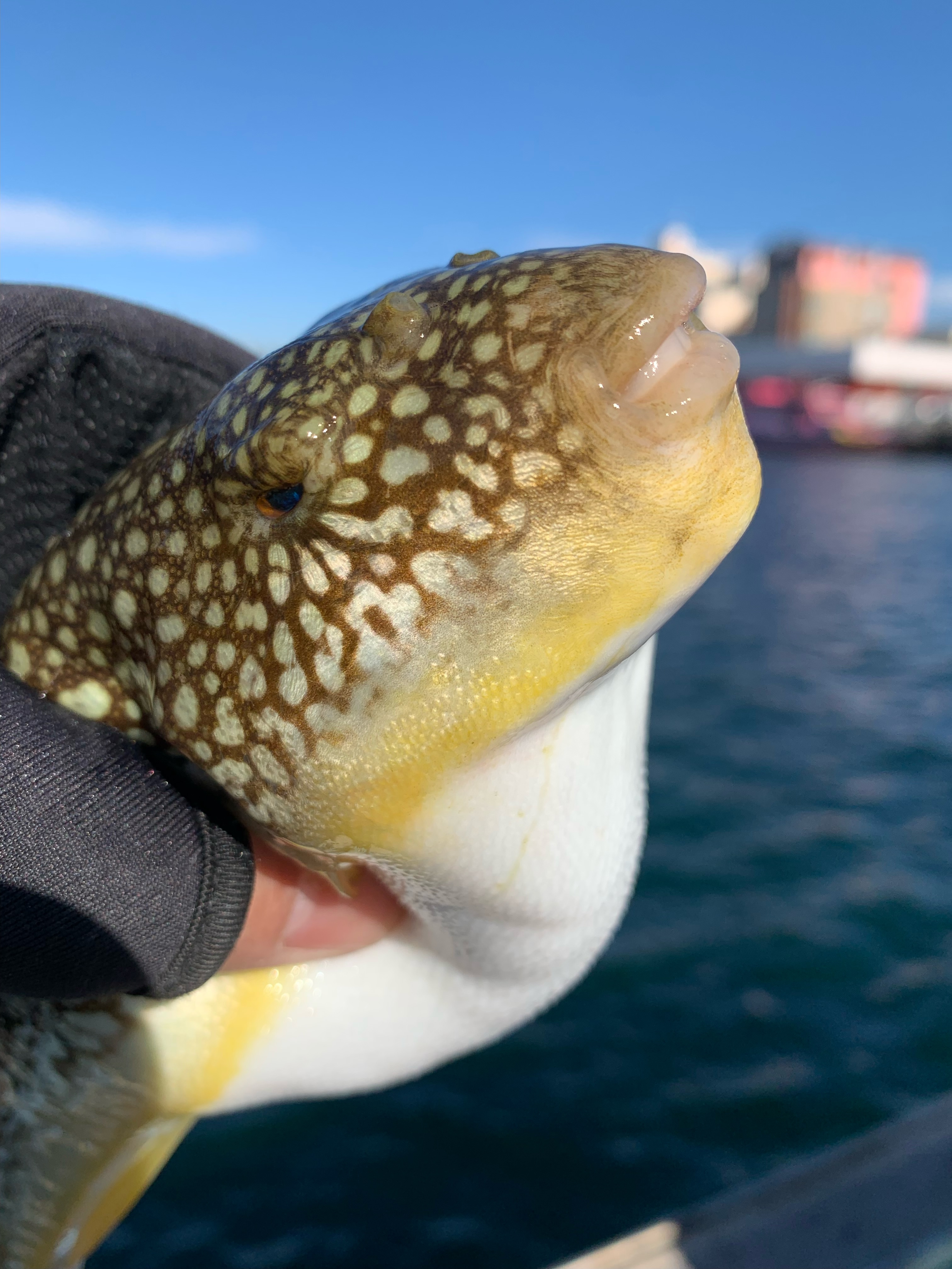 前日は爆風の極寒ということで当日もひやひやでしたが、風もなく良い天気に恵まれました!(^^)!エサは赤貝でスタート!!しかし、開始二時間ほど私だけアタリも無く不安立ち込めました|д゚)ミル貝へチェンジしながら根気よく誘っているとようやくアタリが!!記念すべきファーストフィッシュはコモンフグ!!( ^ω^ )その後も良型ヒガンフグも数匹釣れ満足な初釣りスタートでした(^^♪