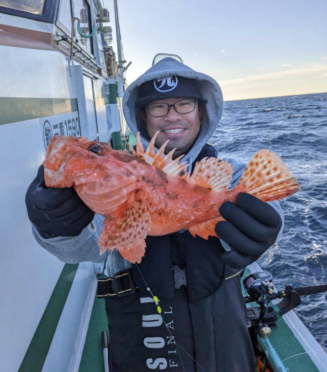 冬といったら鬼カサゴ!ということで御座の智栄丸さんへ鬼カサゴ釣りに行ってきました。水深140m前後を150号のオモリに天秤フカセの2本バリで狙います。この日は沖の潮が速く仕掛けが底で安定しにくく、本命の鬼カサゴは4匹の釣果となりました。底どりをいつも以上に小まめに行い、仕掛けもなるべく潮の影響を受けないようにフロート等の付属品は付いていない仕掛けにしましたが思うように釣果は伸びませんでした。速潮攻略も今後の課題です(汗)