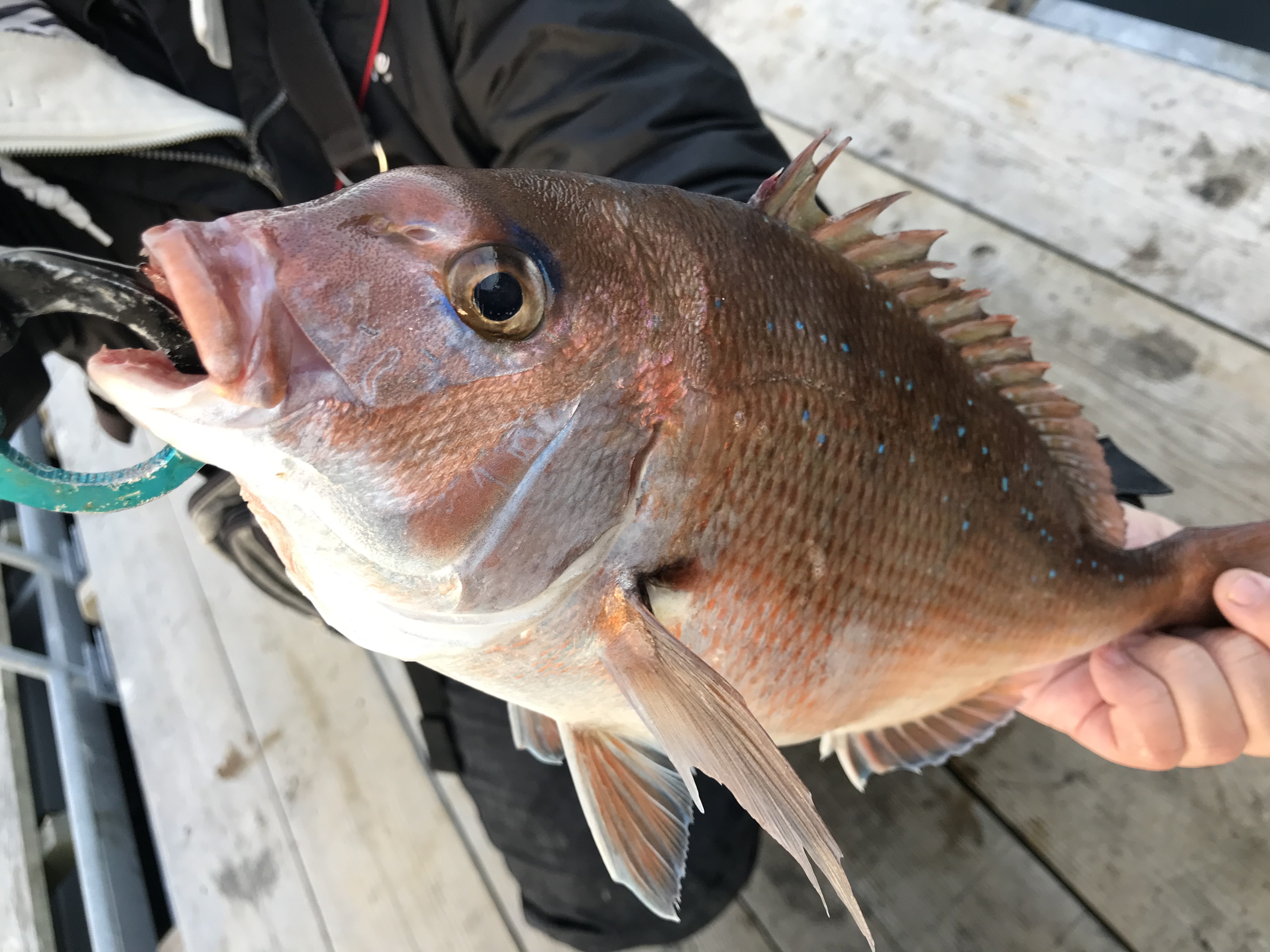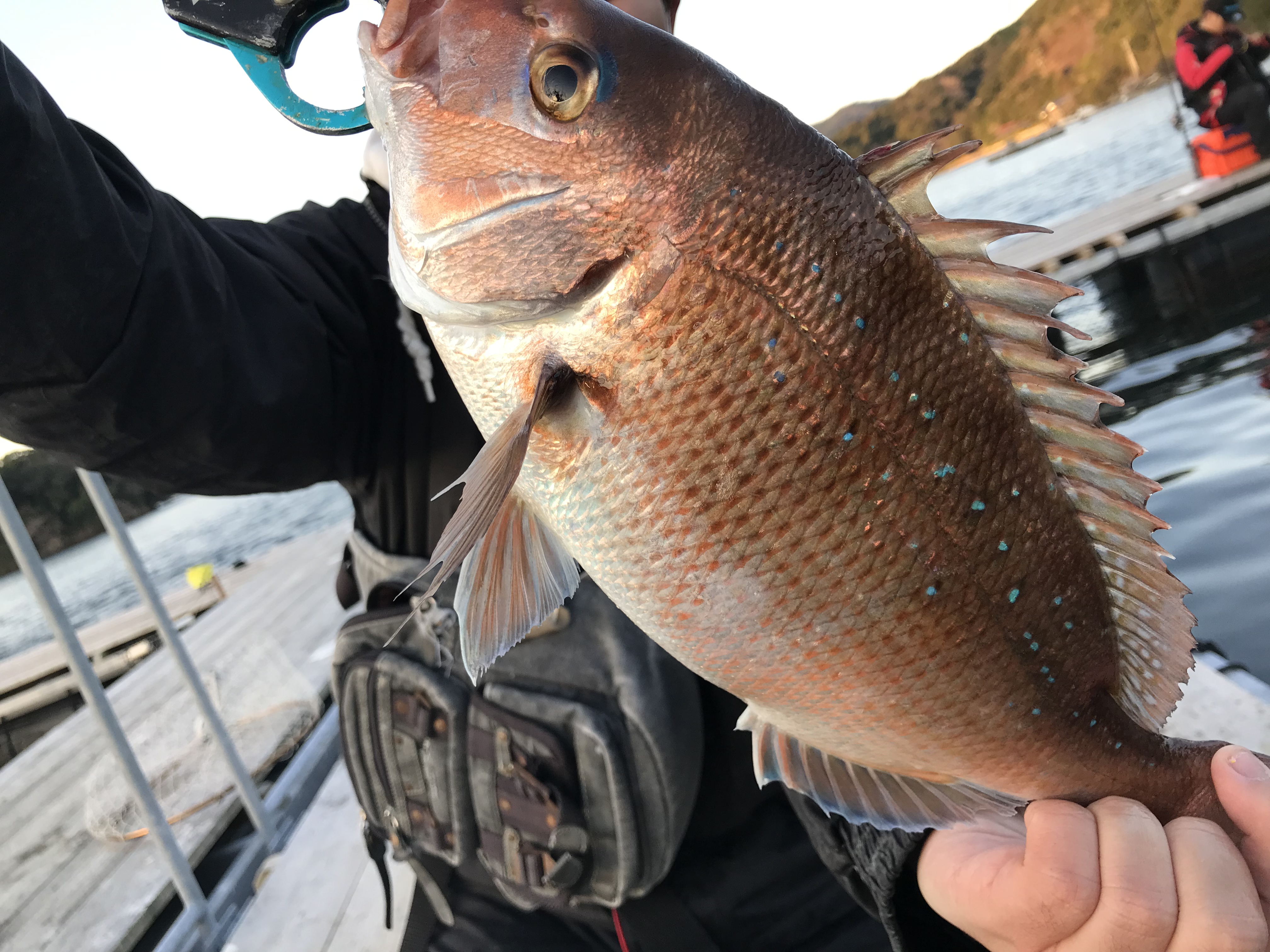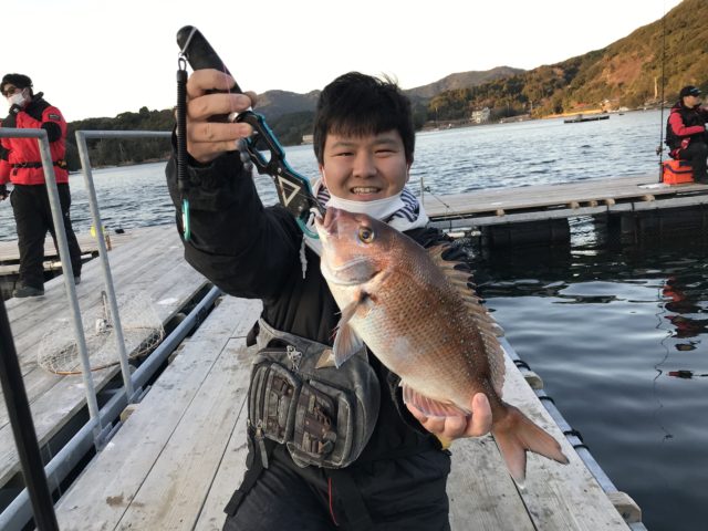 今回は脈釣りのみでやり通すことに。まずはアタリエサを探します。定番のマダイイエローからスタートしますが反応無し。周りが釣れだしヒットエサを聞いているとムール貝でヒットしたという声が……すかさずムール貝に変更し底から50cm上げたところでヒット!綺麗な真鯛でした!次々と真鯛を釣り上げ最終的に6匹釣れました。アタリエサは黄色のエサ(マダイイエローやムール貝など)です。ボケも効果抜群でした!