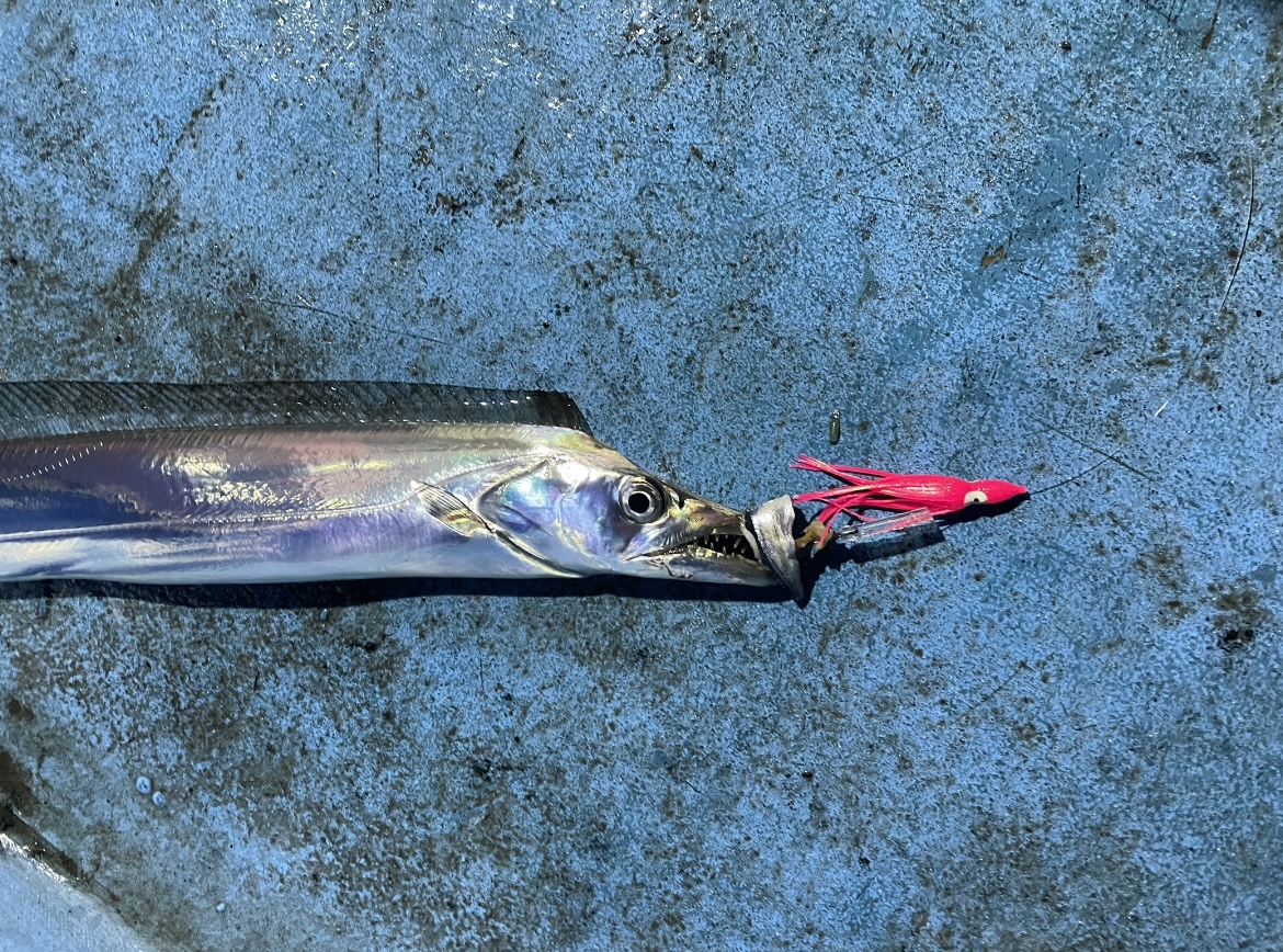 まずはお土産用のタチウオ釣りを焼津沖でやります。天秤仕掛けのオモリ80号で3時間ほどやります。ハリス5号にタコベイトとケイムラパイプを付けた仕掛けで連発♪