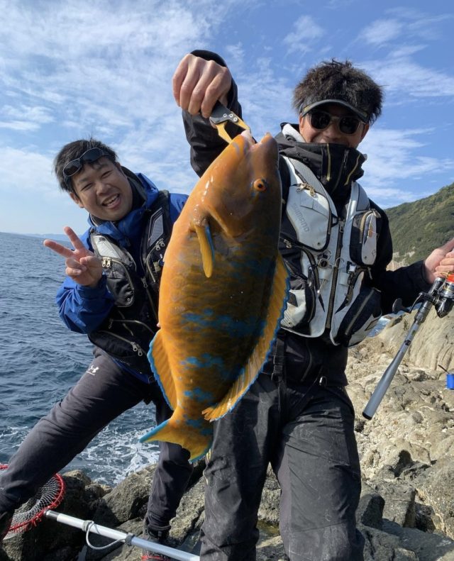 レバーブレーキで糸を出しながら慎重にやり取りすると上がってきたのは60センチオーバーのヒブダイ!