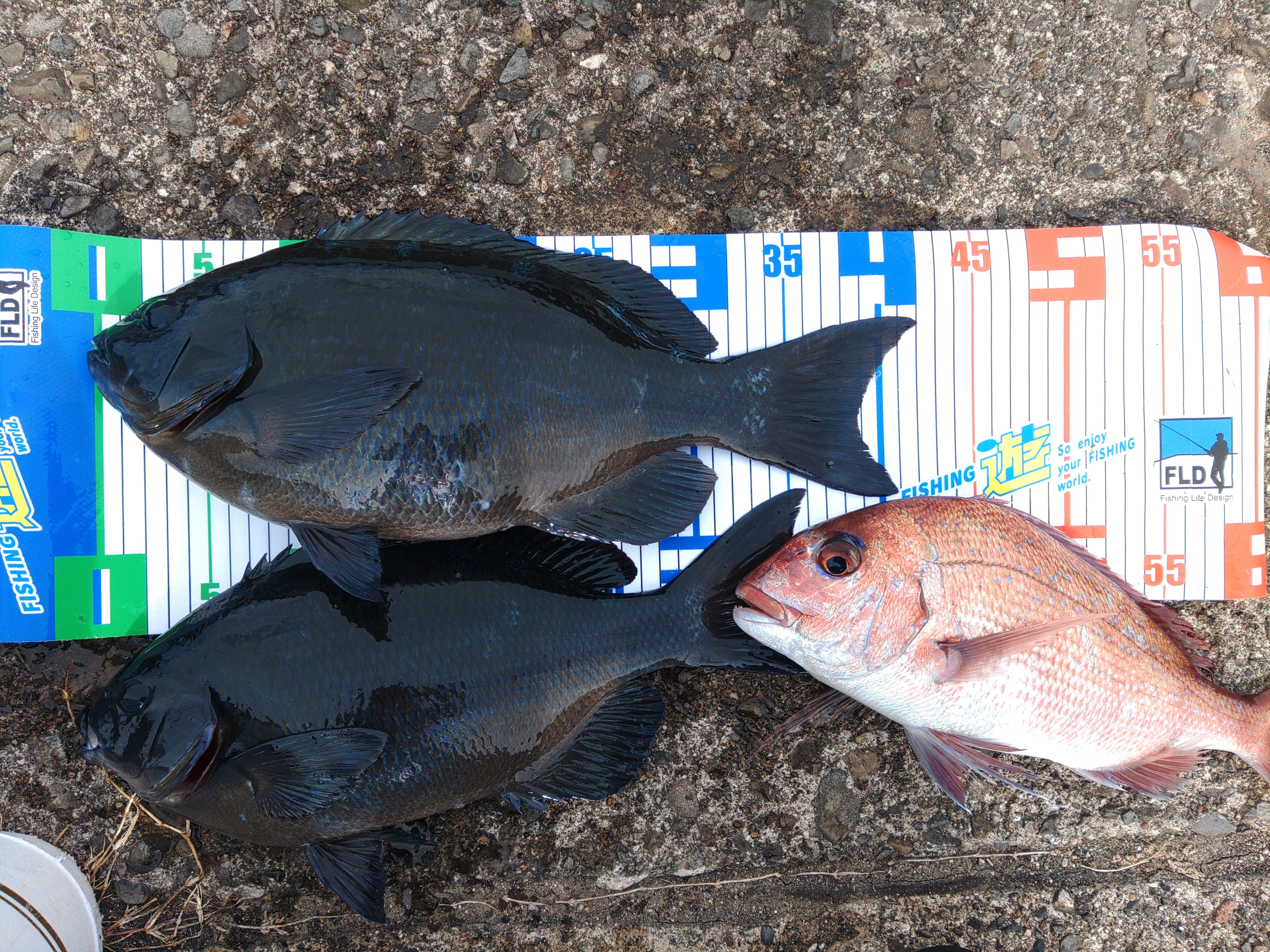 予報通り朝から強風。風を背に受けるように沖向きで始めます。潮もあまり流れませんが、朝一数投はサシエが潰されて帰ってくるので期待しましたが、それも無くなり…やっと当たったと思ったらすぐ針外れ…かなり渋い様子…我慢の釣りをして10時半ごろに40㎝ぐらいの真鯛!!それからすぐに控えめなアタリ!!良い重さで浮いてきたのは42㎝の口太グレ!すぐに35㎝ぐらいのを追加出来ましたが、あとが続かず…サシエが盗られることはありましたが、何も当たらず12時過ぎに納竿しました。