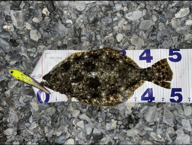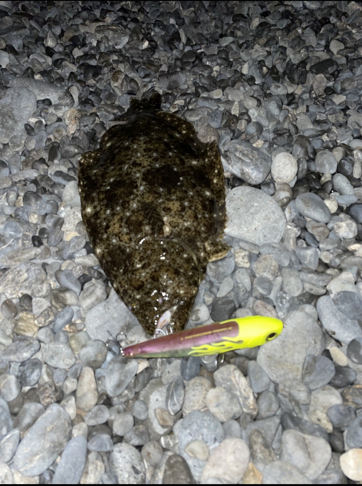 タチウオが焼津サーフで釣れており、ちょこちょこ釣れてます。タッチポンの20gぐらいです。私はタックルが無いので、ベイトタックルにデカトップで遊んでいるとガバッとバイト❗️シーバス?ヒラスズキ?と巻きながら考えていると、上がってきたのはヒラメでした❗️