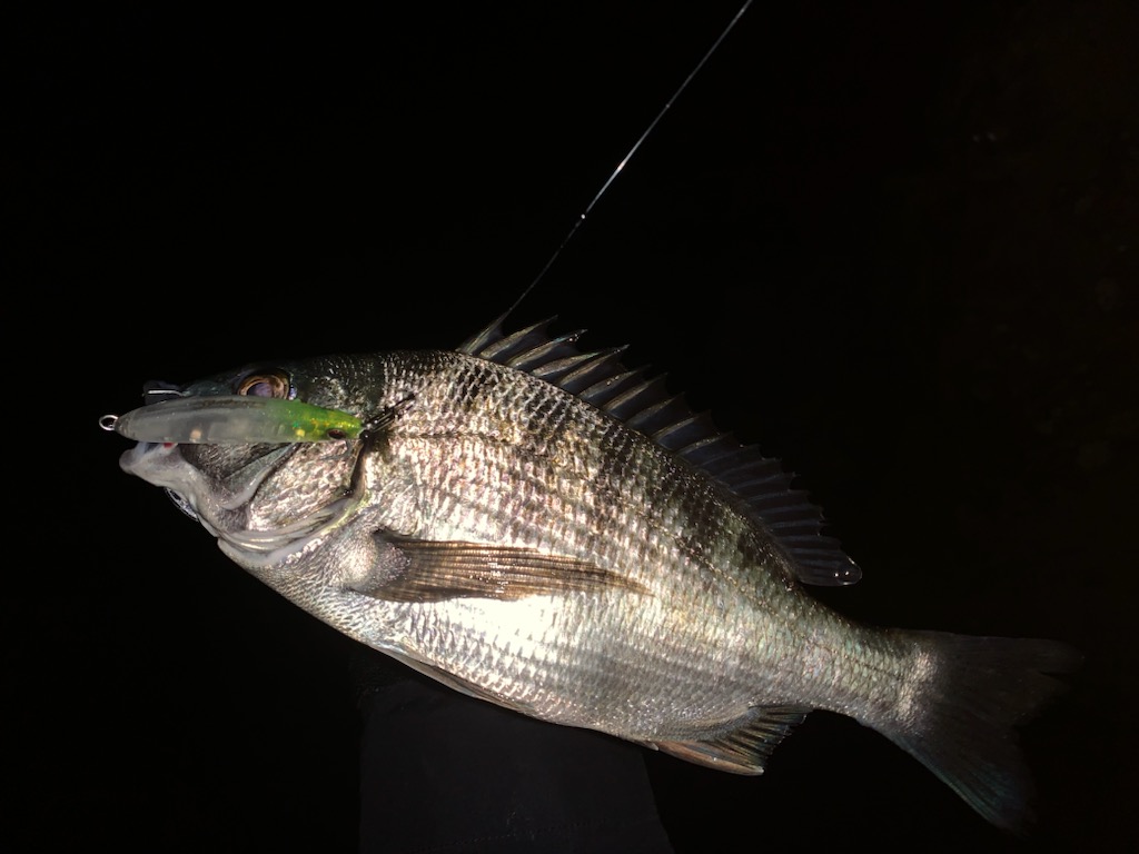 その後アタリはあるが乗らないチヌだと思いルアーをチェンジサイズダウンして巻きスピードを落とすと、思い通りチヌをキャッチしました。
