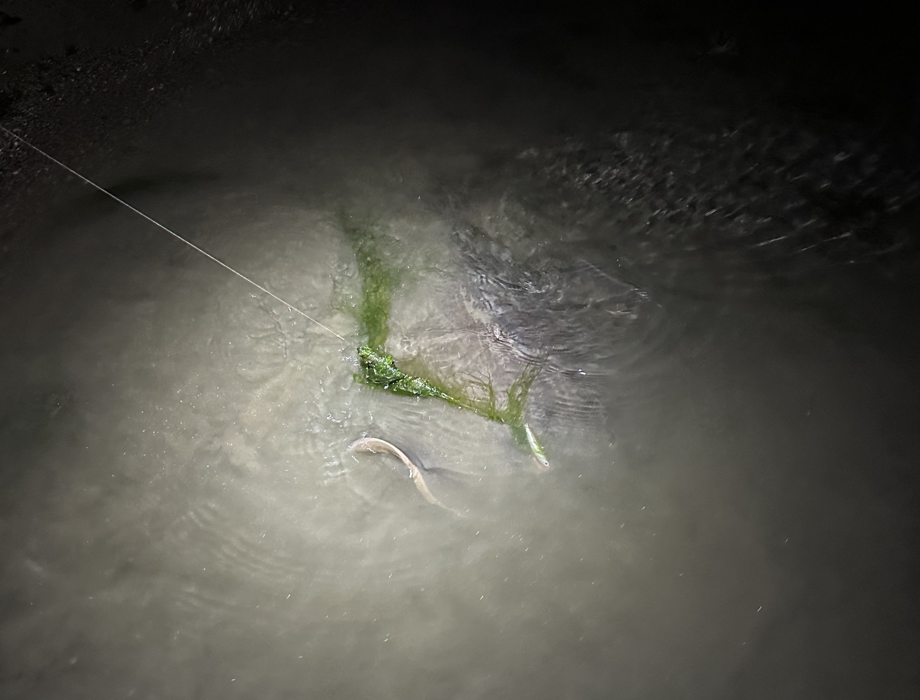 何度もジャンプするのでシーバスかなと思いきや、やけに引かない…。一瞬ライトで照らしてみると銀色で細長い魚体。