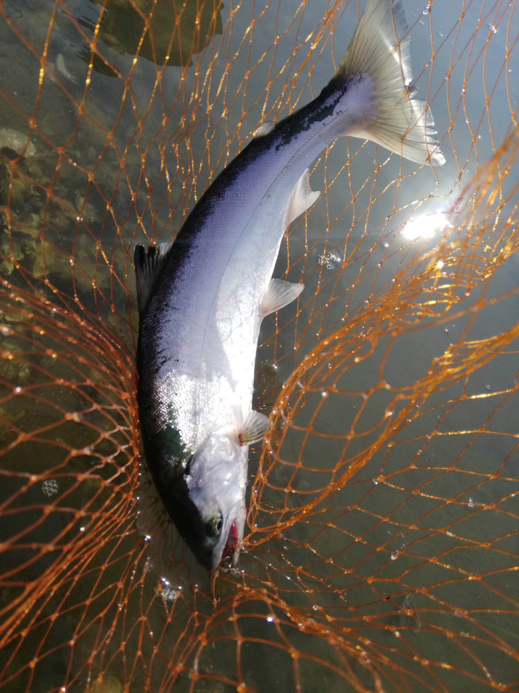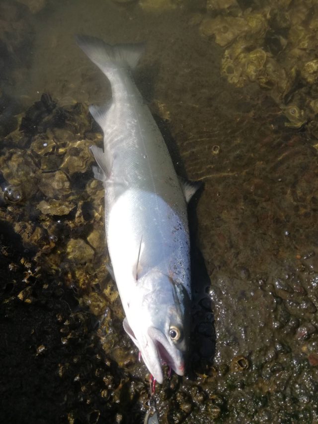 目の前で小魚を追っかけていたのでスプーンを5グラムまで軽くしてゆっくり巻いているとヒット!よく引く!お目当てのサツキマスでした!