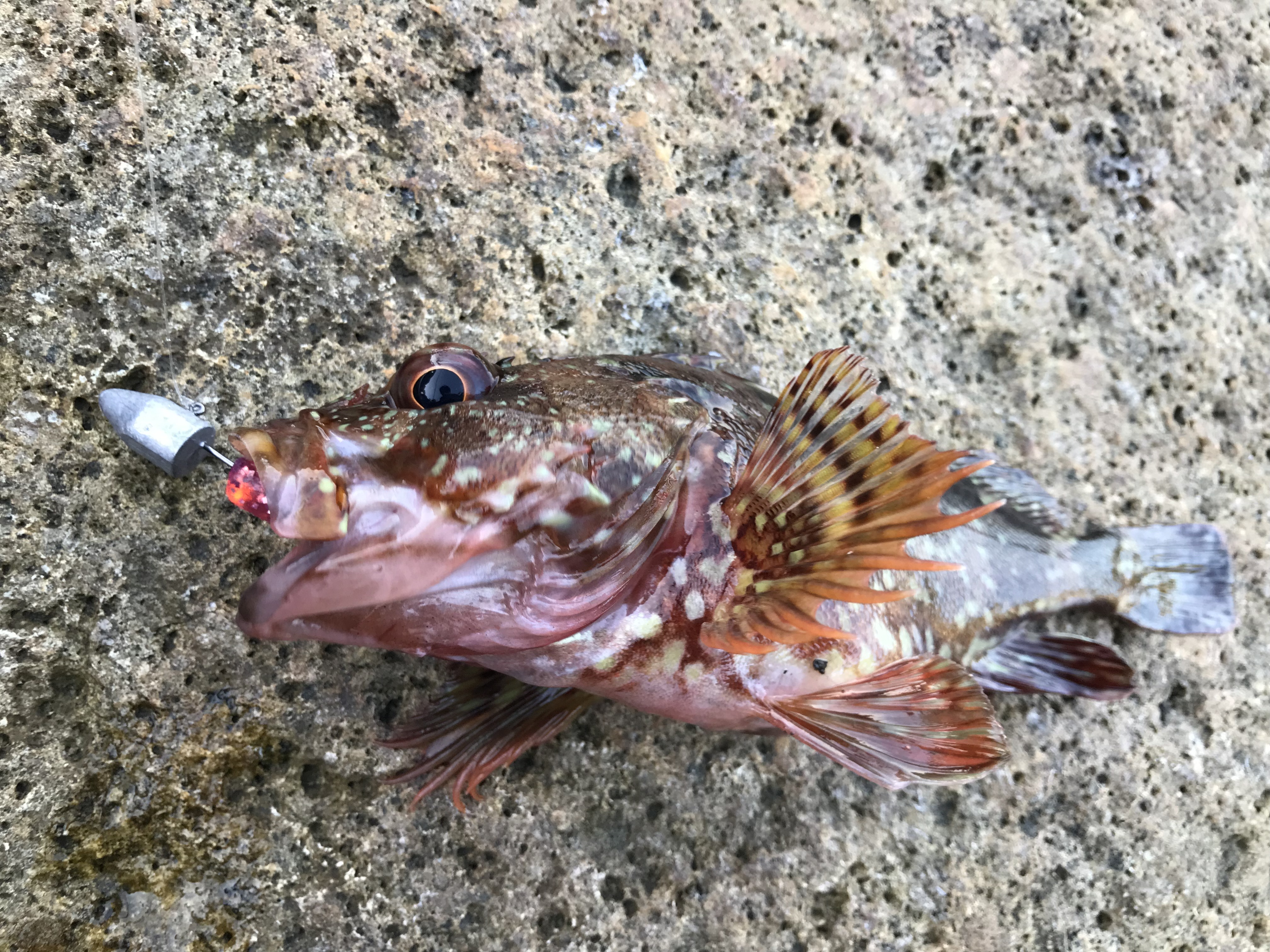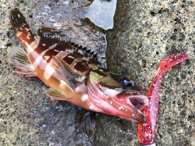 幸先よくカサゴをゲット!ヒットカラーはUVヒラメレッド!2.3回ダートさせてカーブフォールで食べてきました。