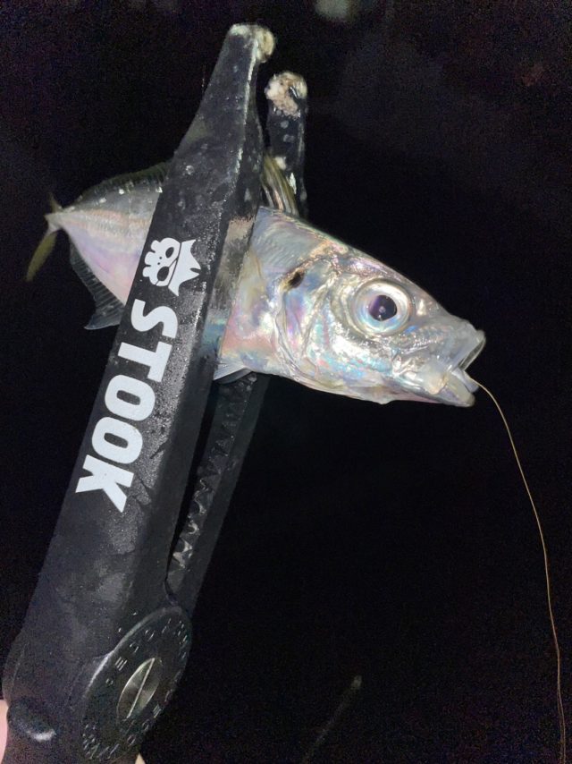 その1投目でヒット!やっぱりこれやな。少し深いところにいるようです。連発モードではないですがアプローチ角度を変えながらポツリポツリとアジは全てアミアミでの釣果です。