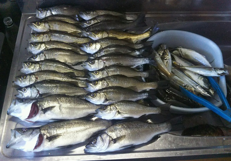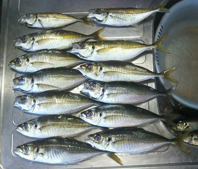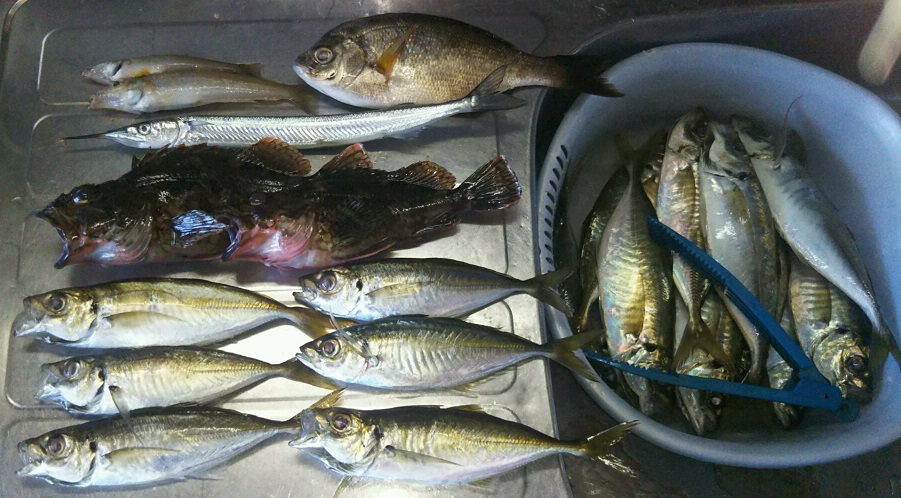 昼間の釣りも少ししてみましたが雨後の爆風の中、キス2匹とカサゴ1匹フグ多数で終了して夕暮れに備えます。暗くなったこ頃ポイントに入りセイゴを探していると見つけた!一気に追い込んで小型が多いが19匹確保で風向きが変わり釣りにならず移動するがセイゴからの反応は無くアジ3匹で移動、ラストの場所は風が正面から吹き付けているのでウエイトを重めにして投げてると超絶微かなアタリが出るが食い込まない、何度やっても食い込まない。爆風の中 そろそろ触る,,, 誘いを入れると竿が止まった!アワセ、掛かった~浮いたのはナイスアジ!で確保、居たねー 同じパターンで4匹釣り風が収まって来たのでウエイトを落とし誘いでいくと見事に食った!これで4匹釣りラストは探しながら動いて3匹追加で1匹抜くところで落ちる、そしてカサゴが釣れたのでラストに移動してセイゴを狙うと見事に食って確保、しかし連続で2匹バラシ今回の釣行は終了です。