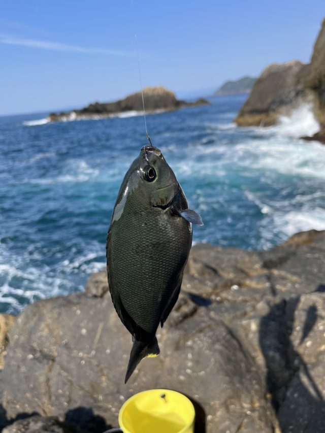 若干荒れた難易度高目な磯に下ろして頂き、濡れながら釣り座を探してスタート。めちゃくちゃルアーを投げたいサラシが広がっていますが、今回はめちゃくちゃ我慢してオキアミを投げます。生オキアミ3kgを2枚とグレパワーV11、グレパワーV9徳用、活性グレ起爆剤。後半は風が強くなってきたのでグレパワー沖撃ちスペシャルを追加しました。開始早々にウキが一気に沈みアワセを入れるとその場で首振り?(グレの場合首振りと言うのでしょうか)、全く浮き上がる事なくその場でバラシ、、、無念。引きはこの日一番、40cm近くあったのではというサイズ感でした。その後はサラシ中で岸際に留まる流れを見つけて岸際キープさせると20cm後半までのサイズがポンポンと釣れて10匹程キャッチ出来ました。一番可愛い魚の写真だけとって他の写真撮るの忘れてました。