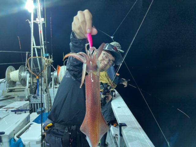 水深は40m程鉛スッテは20号で釣りをします。明るい時間は何も反応がなかったですが日が落ちた後電気をつけてしばらく経ったら僕にもヒット。その後もポツポツとヒット