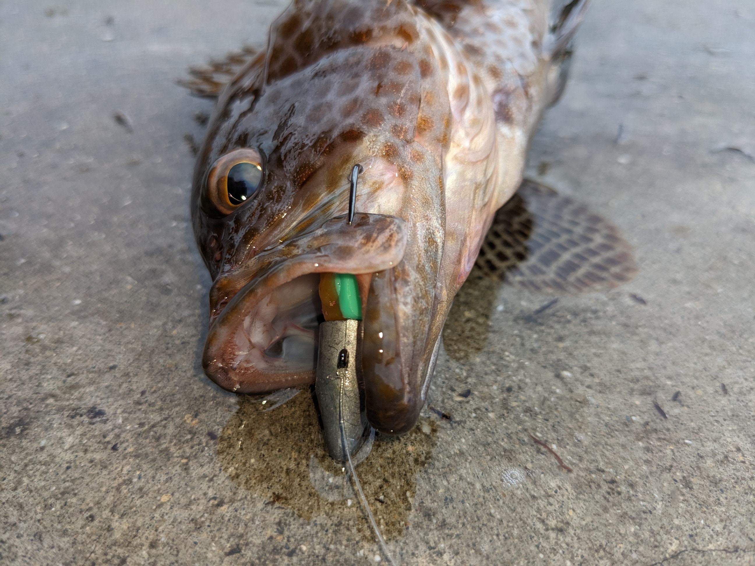 1時間ほどノーバイト。ホントに釣れるのか不安になってきましたが潮が下げに入って動き出した瞬間にドリームアップ・ペティシャッドにガツンとアタリ。グリグリ巻いていたので、アタリがガツンとくるのが衝撃的。