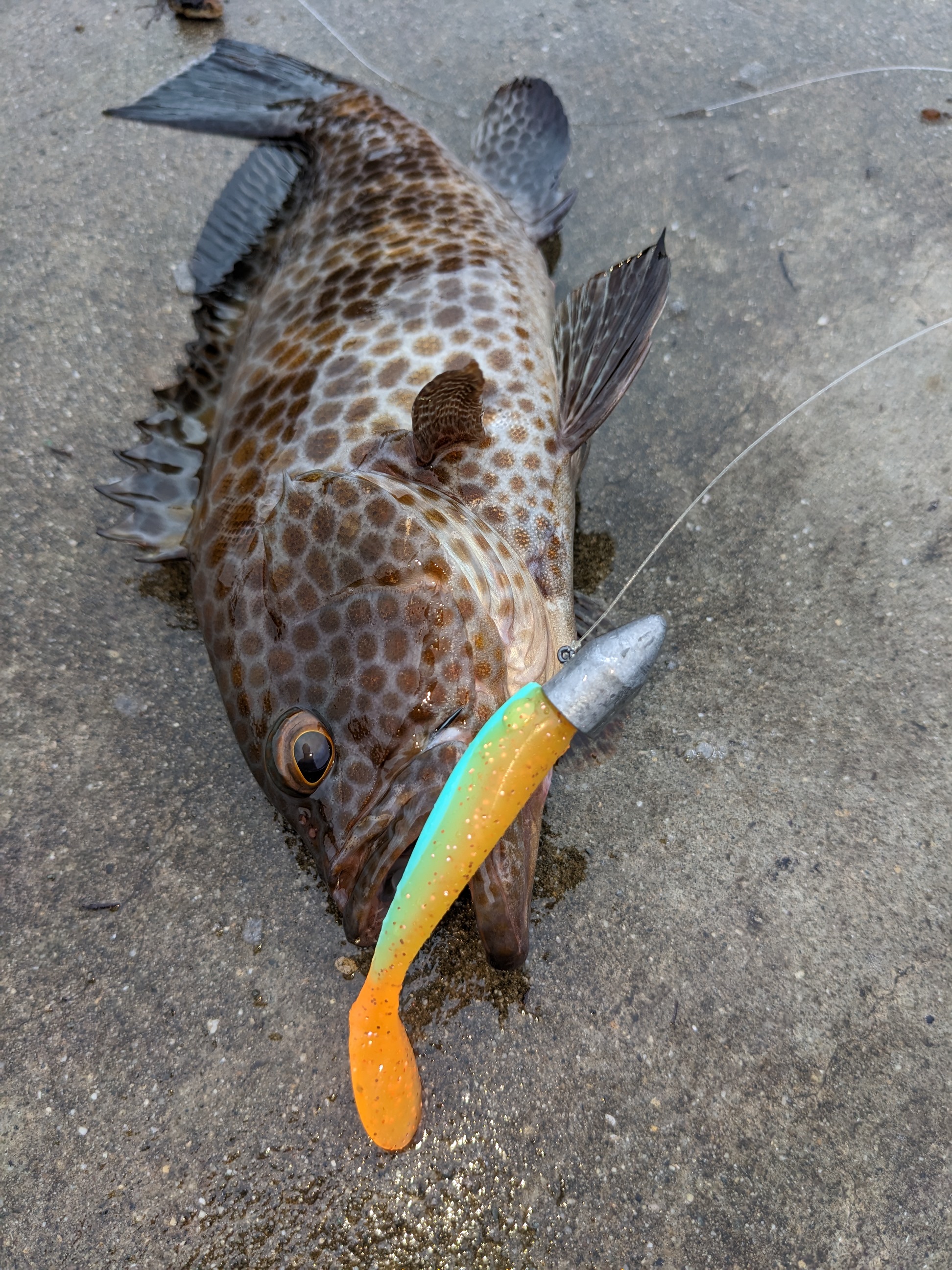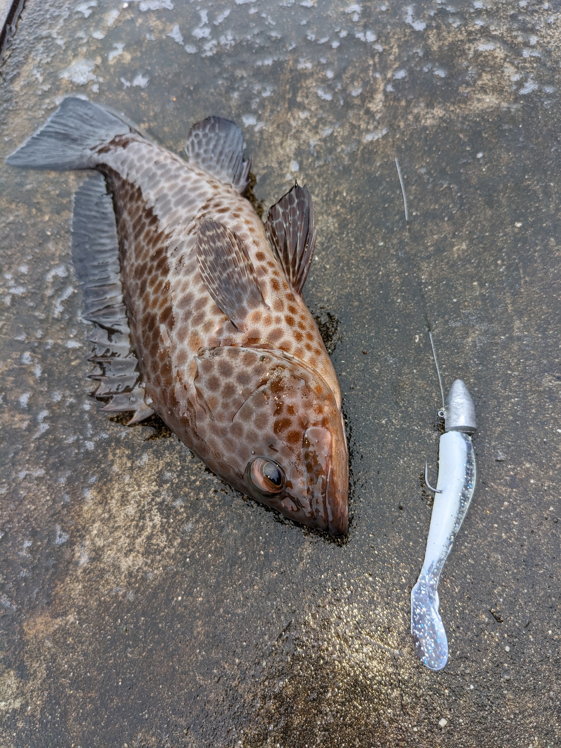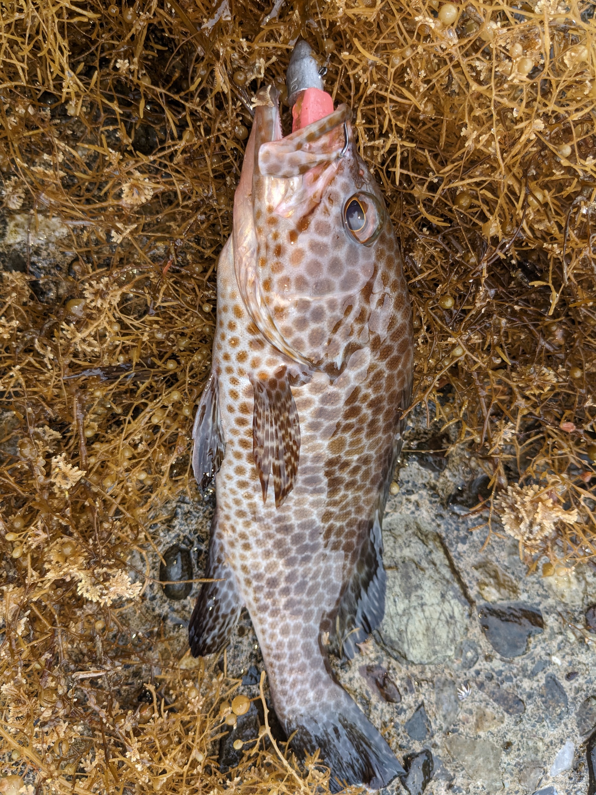 藻だらけなので強引ファイト。上がってきたのは狙っていたオオモンハタ。25センチちょいのやや良型です。