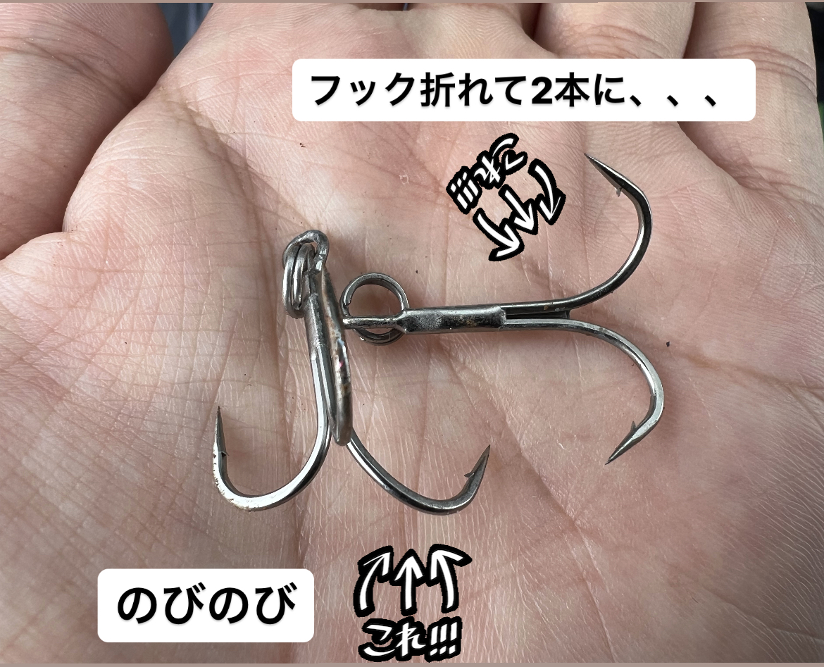純正フック2本は残念ながら伸ばされてしまいましたがリアのみ変更していたフックは無傷。大事な1匹をバラさないためにカスタムはしたほうがいいかもしれませんね。