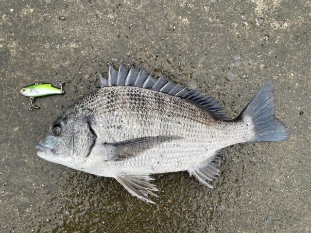 思ったより良い感じ。ルアーはレンジバイブFLDオリカラ。ここ最近デイゲーム実績No.1ルアー。リフト&フォールで狙います。しばらくやっているとシーバスの単発ボイル!そこに投げたらすぐにヒット!でもこの感じは…やっぱりクロダイですね。全然いいんですけどボイルしたのシーバスやったよね?同じベイト食ってんのかな?これで終了しました。