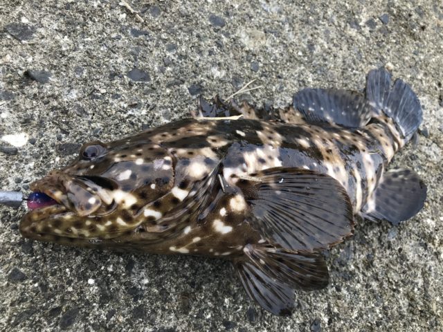 しばらくポイントを休めるため移動を開始。ルアーをペティーシャッドの妖艶ピンクブルーUVに変更。カサゴを釣ったパターンで海藻の上を巻き巻き。ちょうどかけ上がりの所に来た瞬間にドン!糸が出される!めっちゃ引く!上がって来たのは36cmのヤイトハタ!