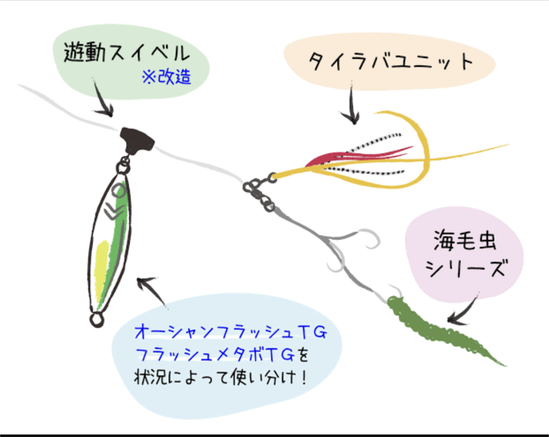 今回の仕掛けはジグラバ(メタボスイマーTG100〜120gにカチッとタイラバの組み合わせたもの)+海毛虫カーリーで挑戦しました🎣