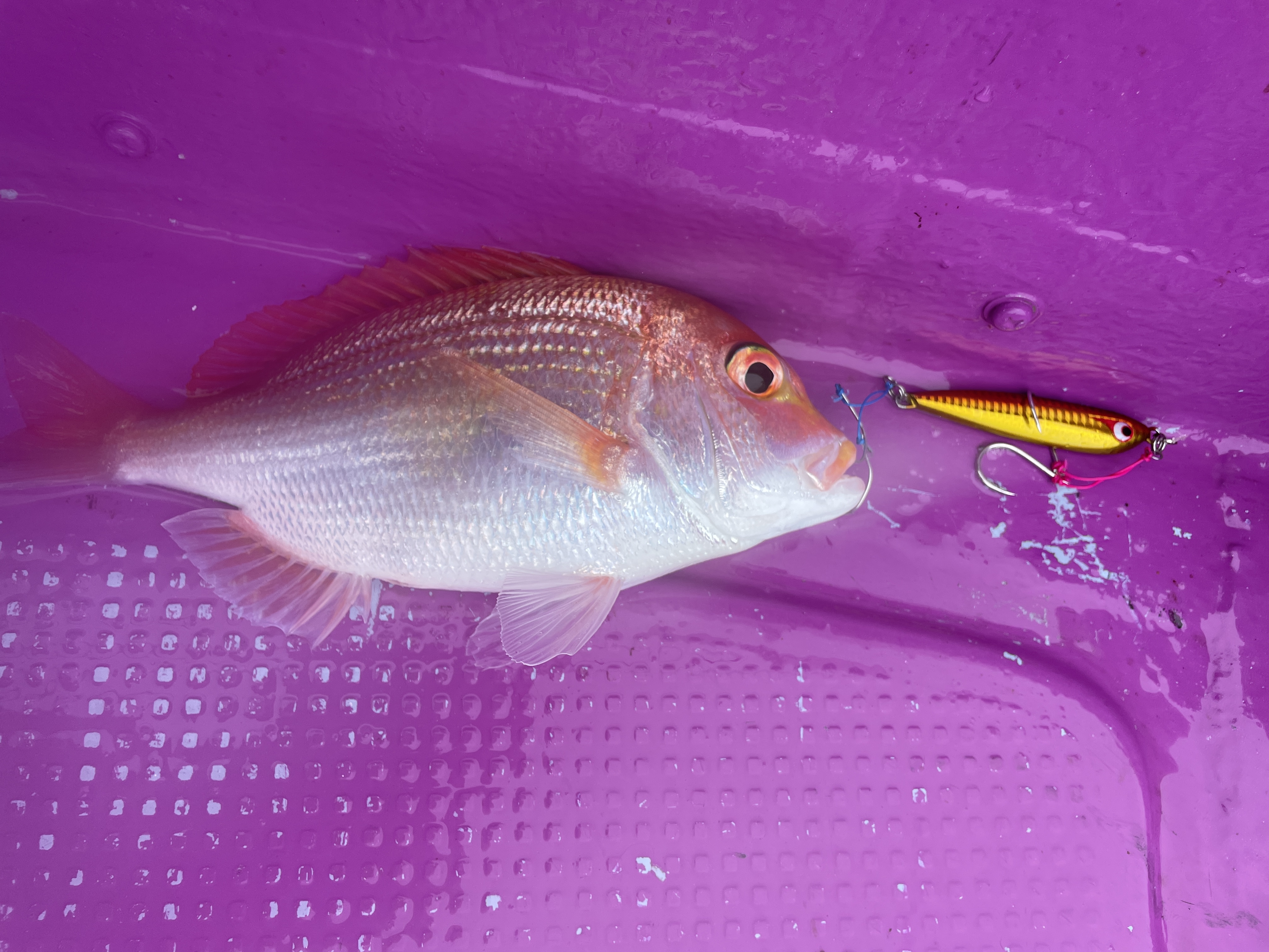 駆け上がりでは中深海だからといってゆっくりしゃくっているといつまでも底ベタなので、2回ワンピッチでしゃくってからゆっくりフォールを入れるようにするとイカ2杯ゲット♪他の人もイカ。この日は深場では魚が釣れないので、浅場に移動してレンコダイ狙いに。幸運にもボックスにタングステンジグの『ケイジ』150gがあったのでやってみるとレンコダイが釣れ終了しました。次回はアカムツ釣りたい!