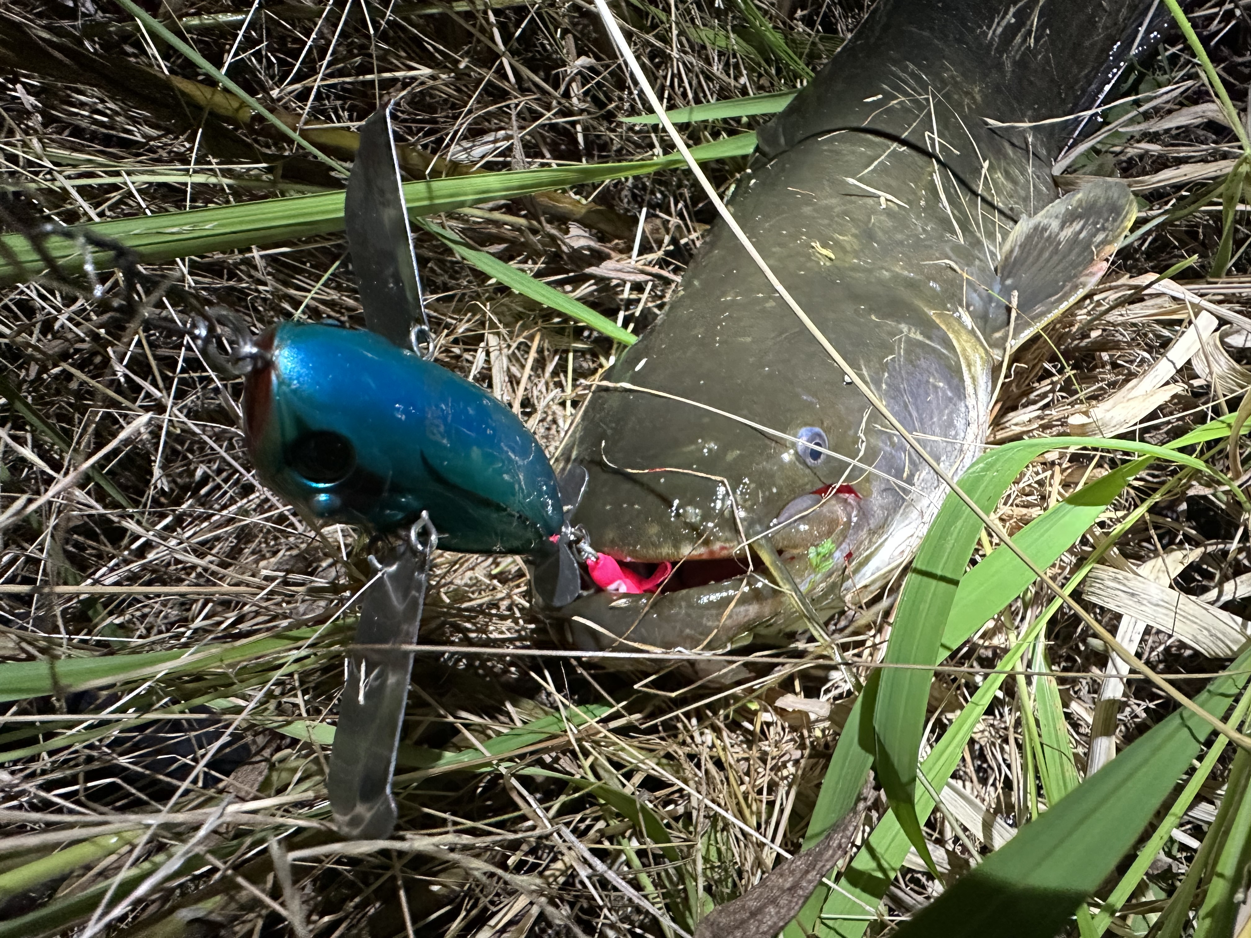 ポイントについてポンパドールJr.を流れ込みにキャストして流すとヒット!40upくらいのが釣れて一安心!その後、移動してオープンエリアで巻いていると強烈バイト!上がってきたのは60ちょうどの極太ナマズ!笑