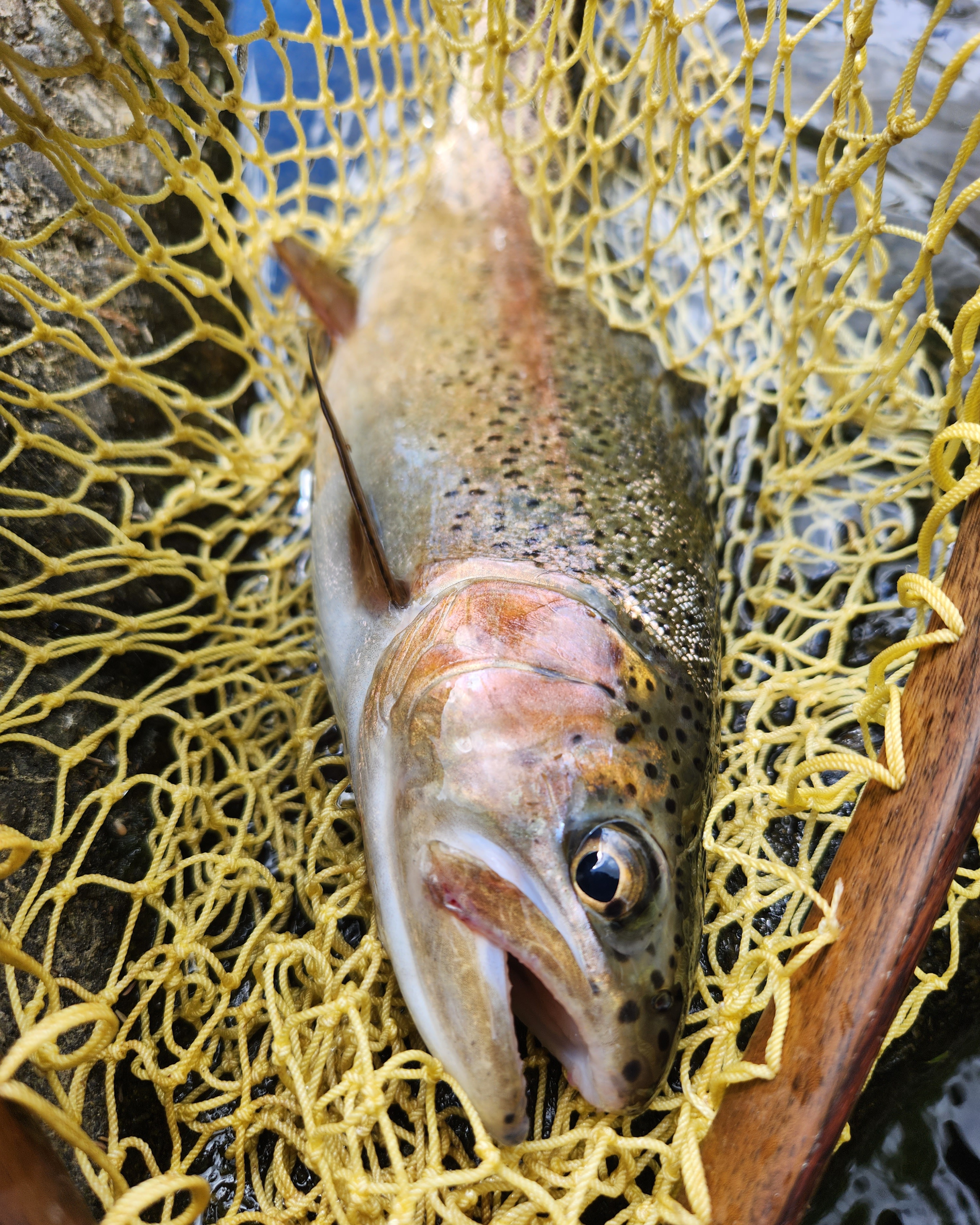 色々なポイントをランガンするとお目当てのレインボートラウトが釣れました!しかしサイズは30センチオーバーと小さめサイズ(それでも引きは強くジャンプもするので楽しい!)