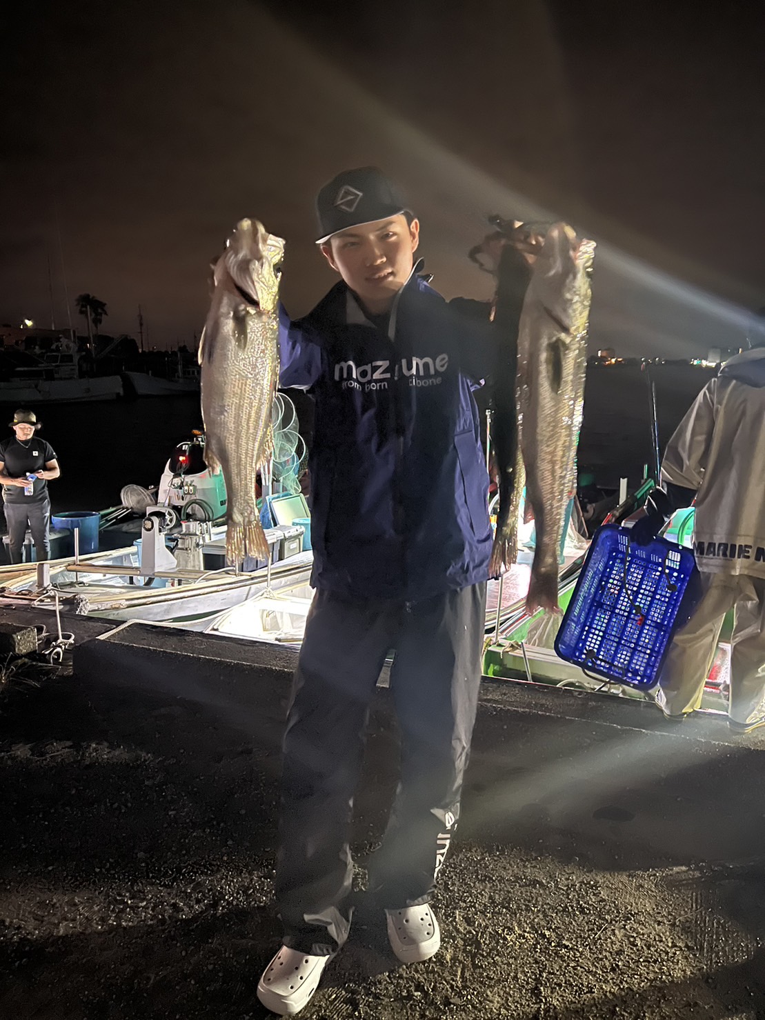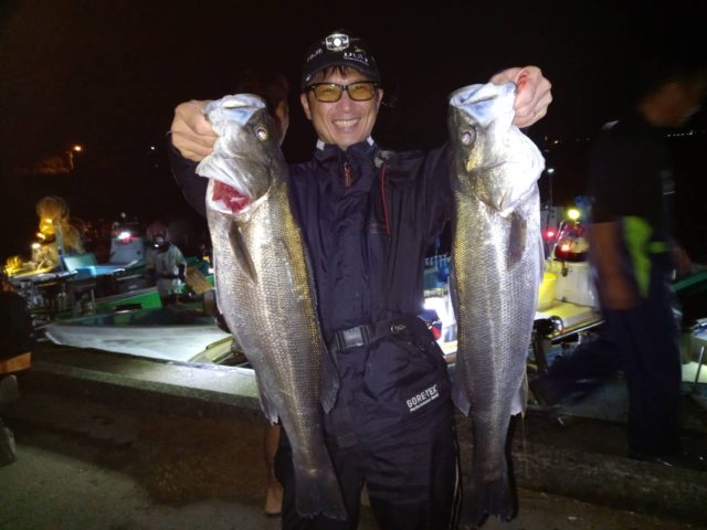 納竿までの3時間余り、40cm~70cmまでを9本釣り事ができました。別の船ではヒラスズキも釣れていました。夏の夜遊びにエビ&シーバスおすすめです。