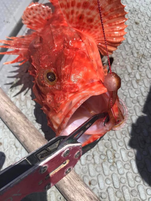 海毛虫カーリーとあいやーたこカーリーYOUオリカラのセッティングで鬼カサゴがヒット。