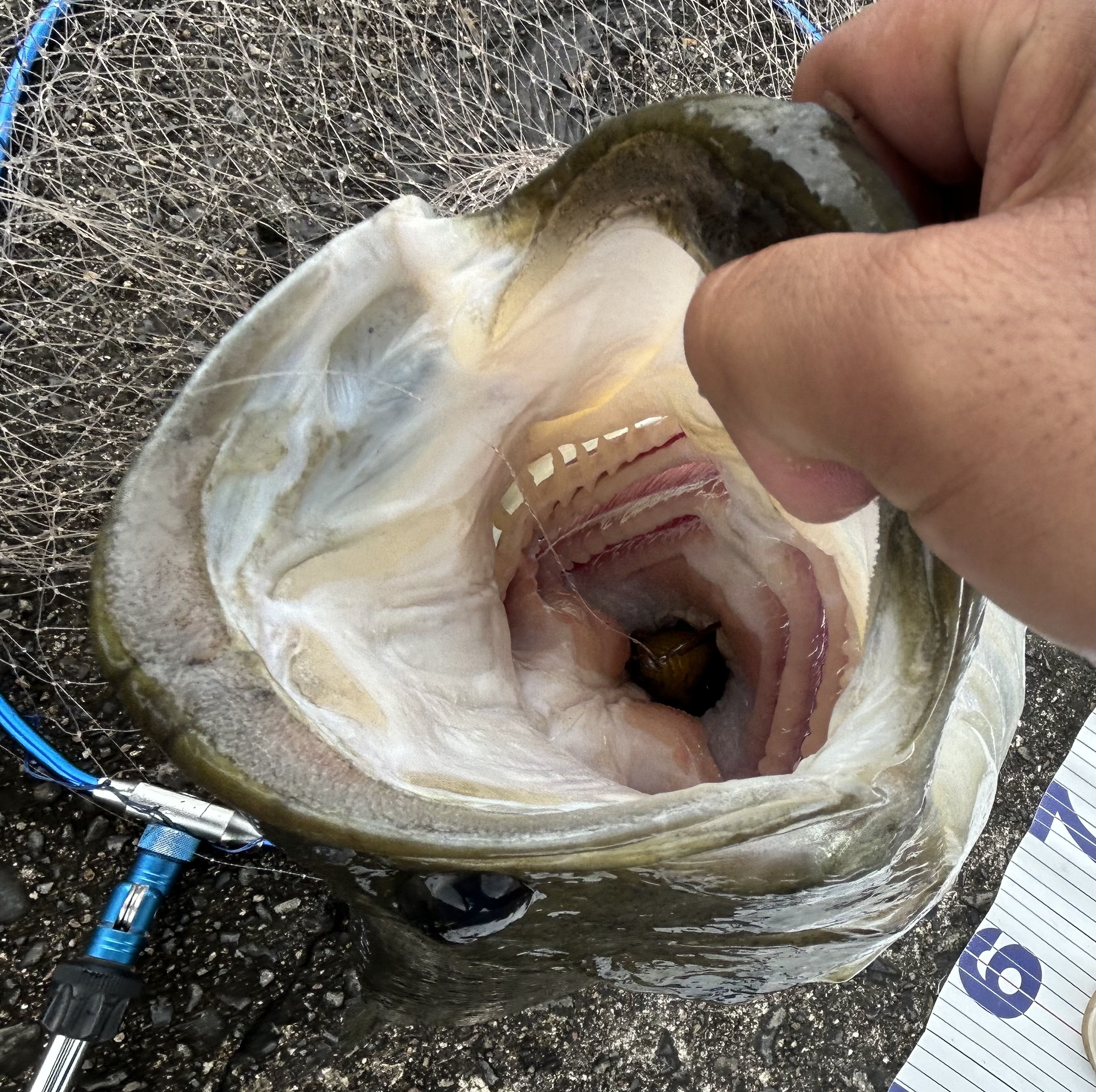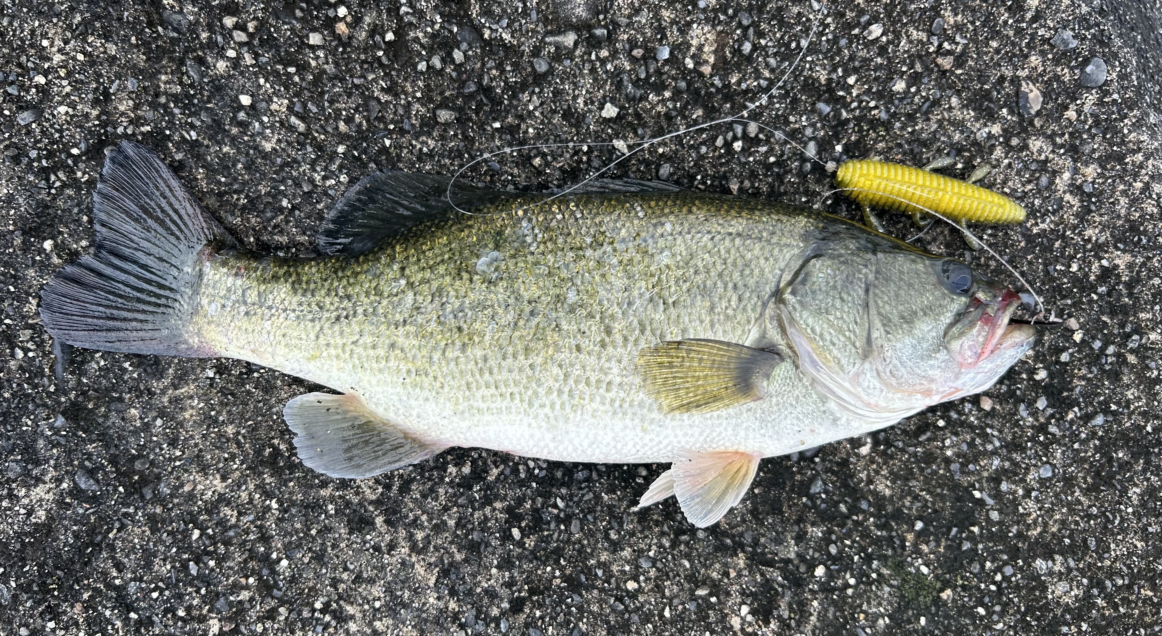 またまた琵琶湖おかっぱりに行ってきました。雨が小降りになってきたタイミングの朝6時よりスタート。土曜日の為、入りたかったポイントには入れず、広範囲を探る事に。ルアーはもちろん一誠 沈み蟲2.6インチ。1時間経った頃、コツッとアタリからフッキングした所、重量感が半端じゃない。障害物に巻かれないようゴリ巻きしバスを浮かせ姿を確認。50cmぐらいだと確信した所でもう1度バスが突っ込み残念ながらラインブレイク。逃した魚はデカかった。その後は入りたかったポイントが空いたので移動。30cmぐらいのバスとギル2匹。ポイントを休めた所で朝のバラしたポイントに再エントリー。その3投目でまたいいアタリ。アワセると今度も重量感がすごい。今回は少し沖で体力を使わせてから寄せてくるとデカい。なんとかタモでランディング。近くの方に写真を撮ってもらいました。サイズは59cm。めちゃくちゃ太くてかっこいいバスでした。ワームを外そうと口を開けると沈み蟲が2個。朝掛けた魚がまた喰っていました。一誠 沈み蟲2.6はデカバスが好反応!琵琶湖バス釣れています!