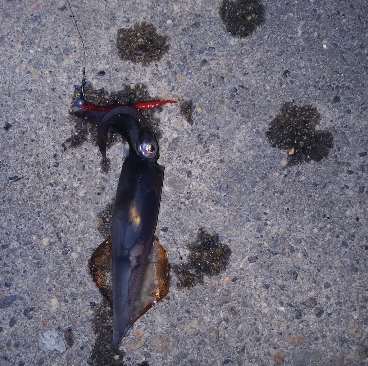 夜に少しだけということで。到着後はじめるとすぐにアタリますがなかなか乗らず。コッ、コツッと楽しませてくれます。写真の豆アジを確保。しばらく同サイズが続き。その後、グッというアタリがあり巻いてきますと何か吹いている❔なんとヒイカが釣れて。初めてアジング中に釣りました。その1杯だけで続かず。エギを持ってくれば良かったと思いながら。アジは時折17cmクラスも上がりましたが大半は10cmほど。いつものジグヘッド0.6gにパワーミニイソメの赤で。
