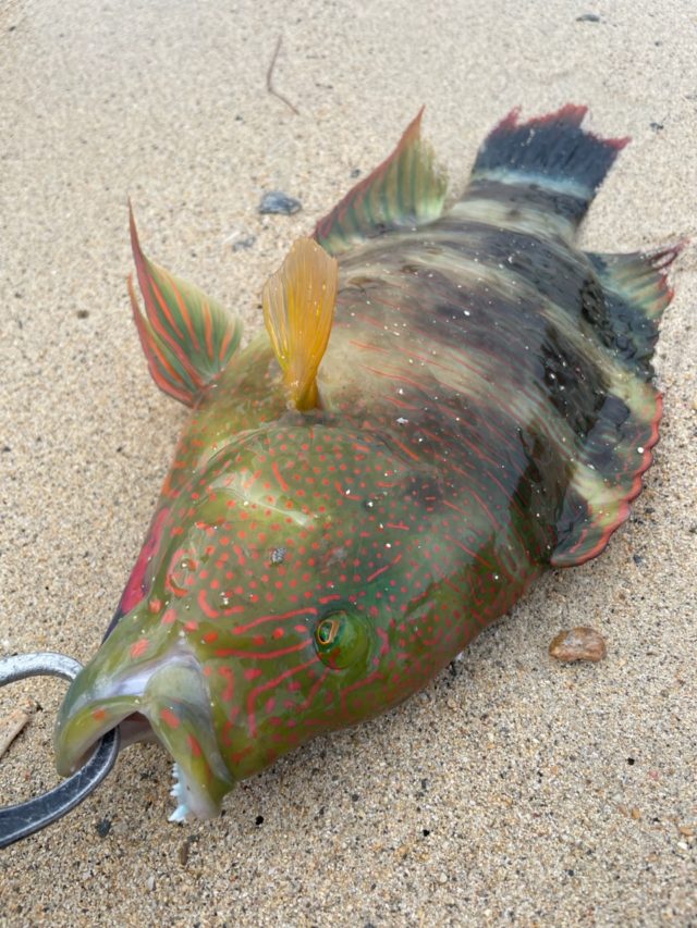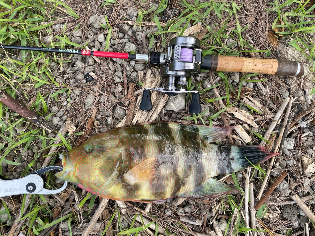 …が意外と釣れない。そろそろ帰るかと諦めかけていた時回収中にヒット!強烈な引きで上がってきたのはカラフルな魚。サイズは35cmくらい。ネットで検索しても中々名前が出てきませんできたがどうやらミツバモチノウオという魚らしい。