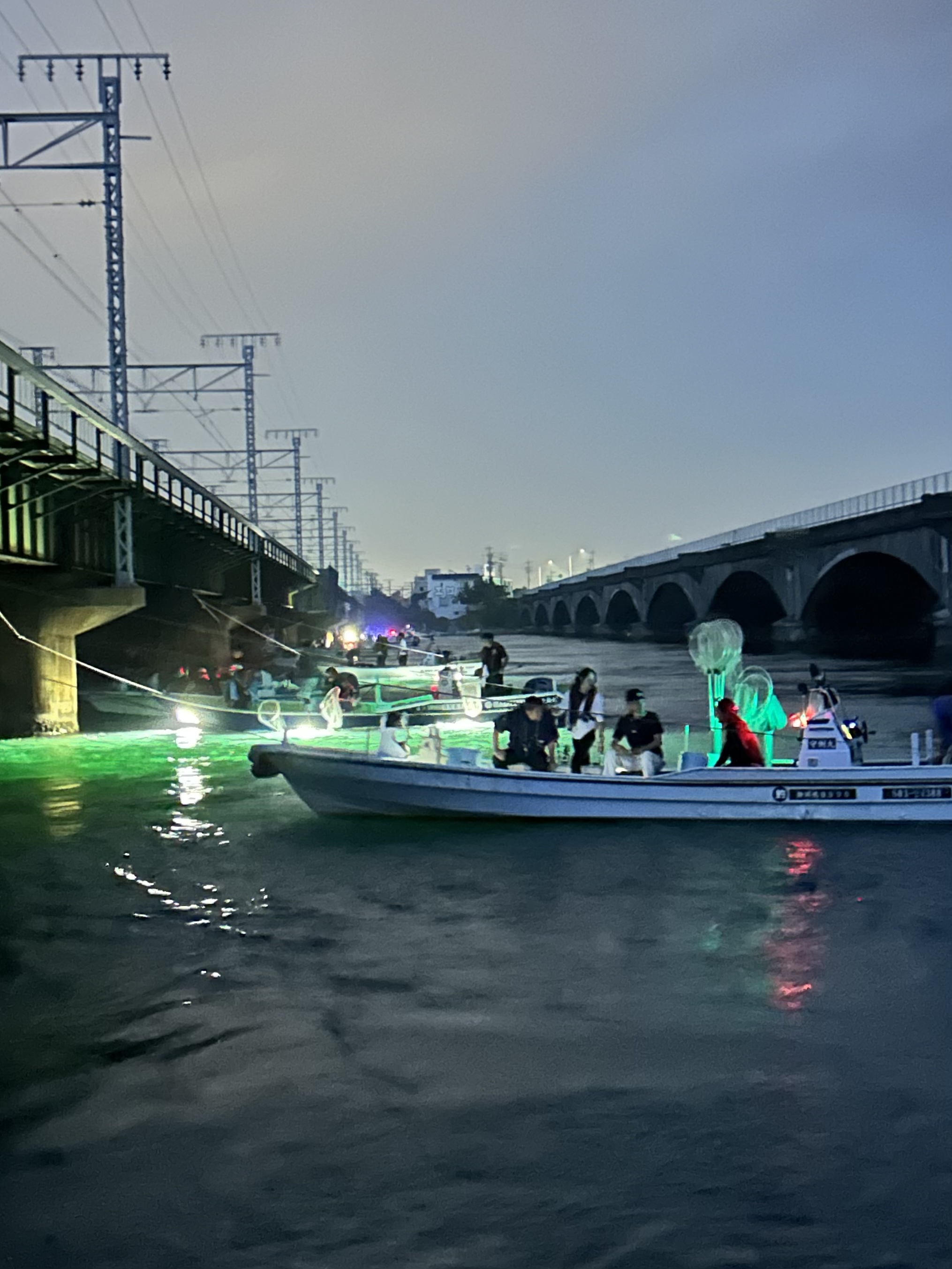 19時半頃に出船しポイントまでは僅か5分。鉄橋に船を固定しいざ開始!!!網を勢いよく入れてしまうと逃げてしまうのでゆっくりが基本です!エビが流れてくるのを待っていると下にはシーバスの群れ…同船した豊橋店宗雪チーフは早速ボートシーバスに切り替えてます!笑