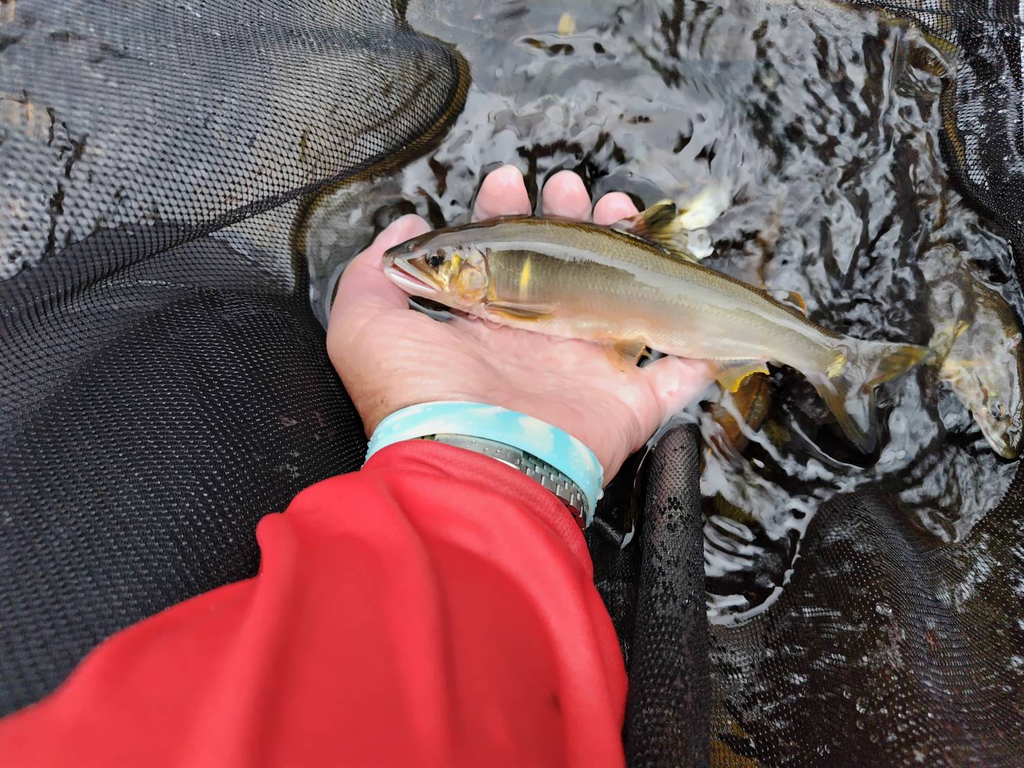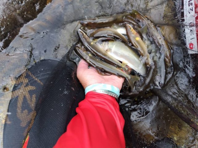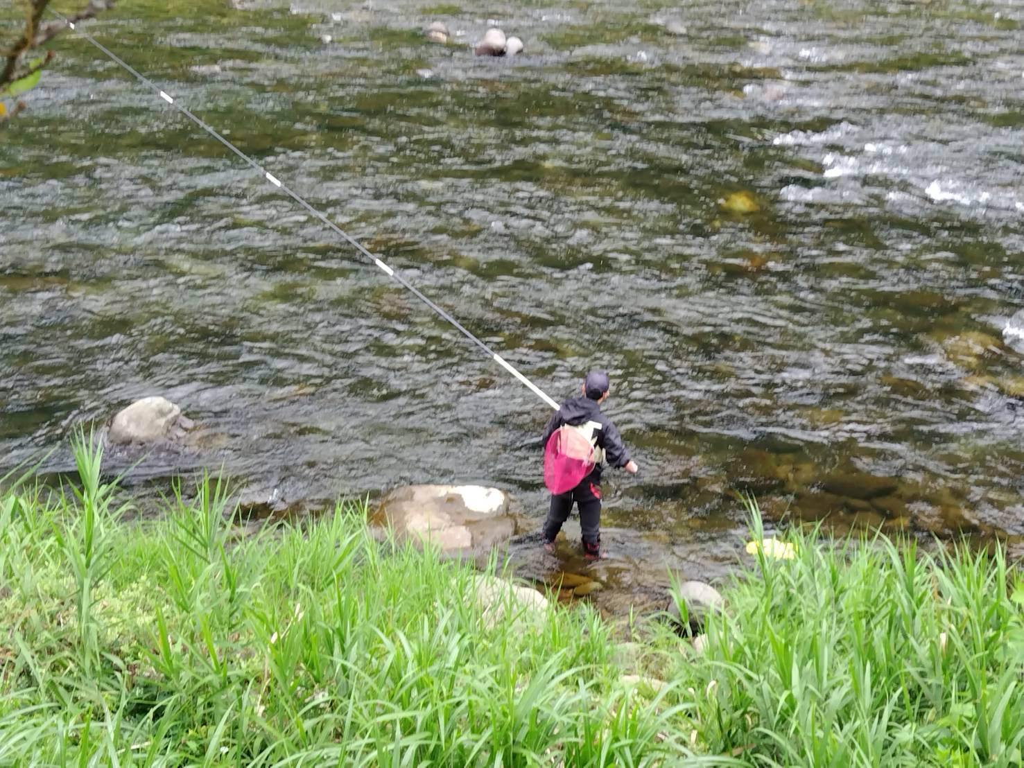 涼しいというより若干寒さも感じつつ釣り開始。すると、開始すぐからポツポツながら、16~17cmが掛かり、13時までに14尾を取り込みました。雨が強くならない内にと、いつもはゆっくりな昼食もそこそこに、後半開始です。なぜかトロ場の鮎は平均して型が良く、掛かるテンポは遅いものの、良型を狙って6尾追加したところで15時、それまでとは違う大粒の雨・・・(。-_-。)それ以降は反応が止まり、ずぶ濡れのシャツで寒さが増したところで納竿としました。それでもほぼ一日釣りが出来ました^O^