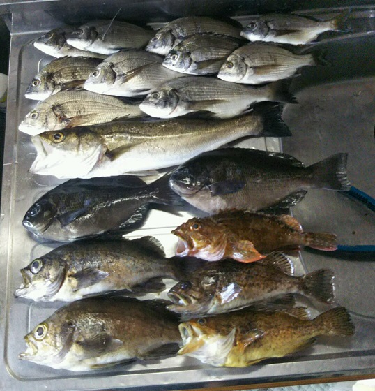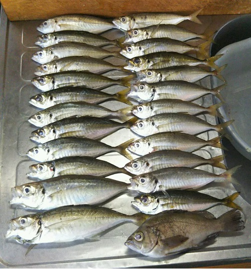 暗くなってからグレを探すがナイスグレは2回バレで小型を2匹、途中クロダイ中も掛かるがこれもバレ。後半でやっとアジを見つけ追加していくと親のアジが2匹釣れる、久しぶりにセイゴも掛かりソイも追加して今回の釣りは終了です。
