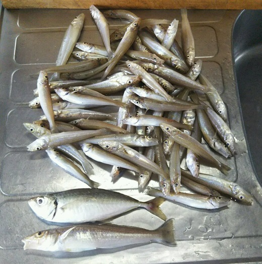 一晩目の釣果がヤバいので昼間のキス調査をしてみる。針も小さ目の6号を縛り投げるとポンポン釣れるが群れが小さいので足で稼ぐことに、午前中1.5時間、午後2時間で121匹釣るもナイスサイスは1ぴきでした。夕暮れにカサゴが釣れキスの部は終了。