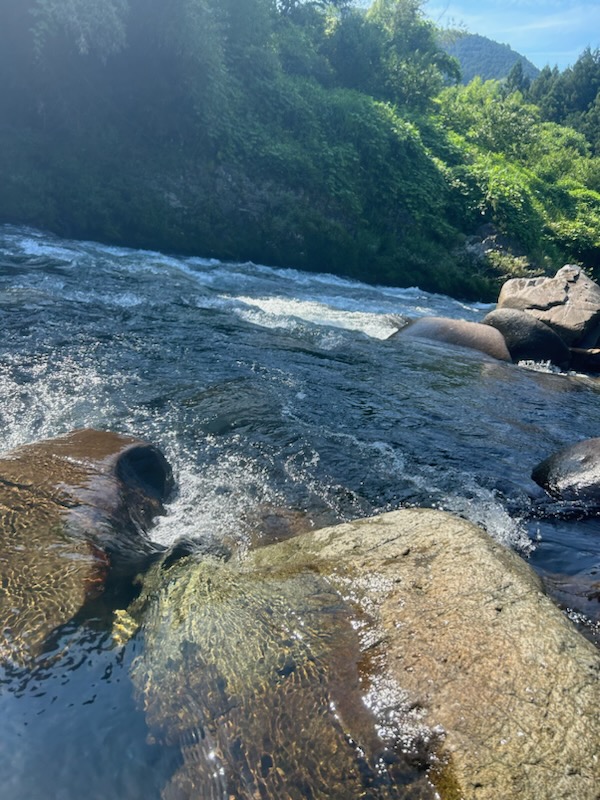 激しい当たりで良型の鮎が掛かりました。そしてその子をつけて、さらに流れの激しい所に誘導すると・・・