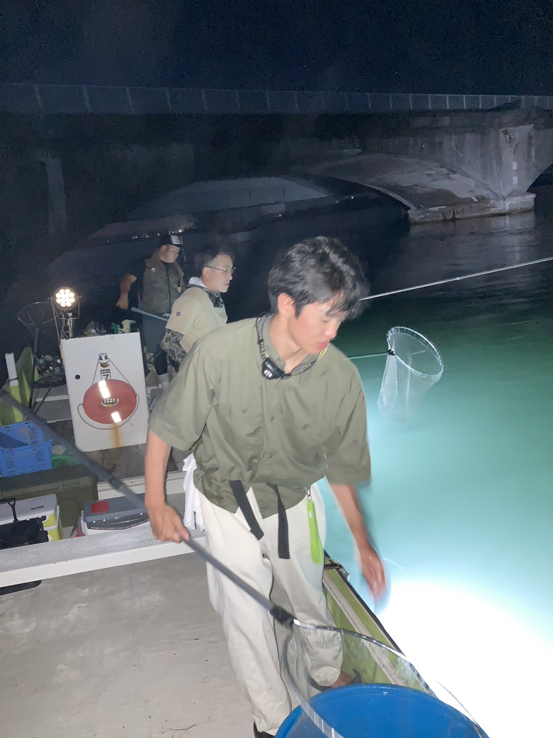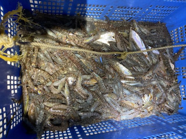 8月2日に浜名湖新居漁港の極漁丸さんにえびすき漁に行ってきました。当日は22時集合の22時30分出発。ポイントに到着し、あかりを点けるとたくさんの車海老が流れてきます。すぐに準備して漁開始♪次から次へと流れてくるため休む暇なく汗だく・・・だけど楽しい♪船長からこのポイントは後半失速することが多いとアドバイスがあった為、必死にすくいました。船長のアドバイスどおり、残り1時間くらいで流れてくるエビの数が極端に少なくなりましたが、前半に頑張ってすくったので、たくさんの車海老を確保できました。最近では一番よかったと船長も言っていたので、良い日に漁をすることができ楽しめました。えびすき漁は人気で夏休みということもあり、当日も多くの家族連れで賑わっていました。週末やお盆休みなどの予約はすでにいっぱいですが、平日の夜ならまだ空きがあります。えびすき漁は8月いっぱいで終了なので、興味のある方は是非行ってみて下さいね♪