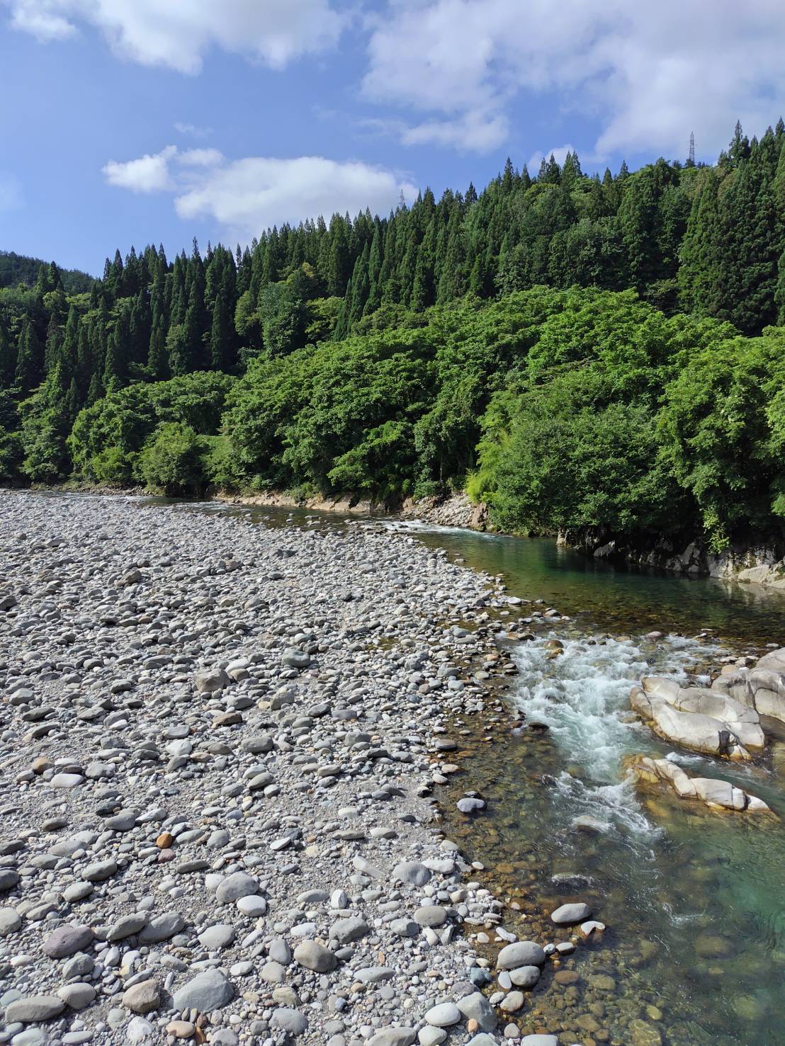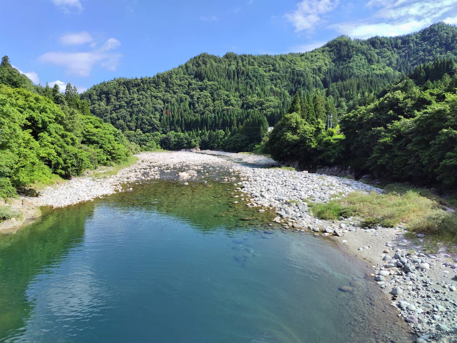 山の緑と水の青、高原川、釣っていて気持ちの良い川です。